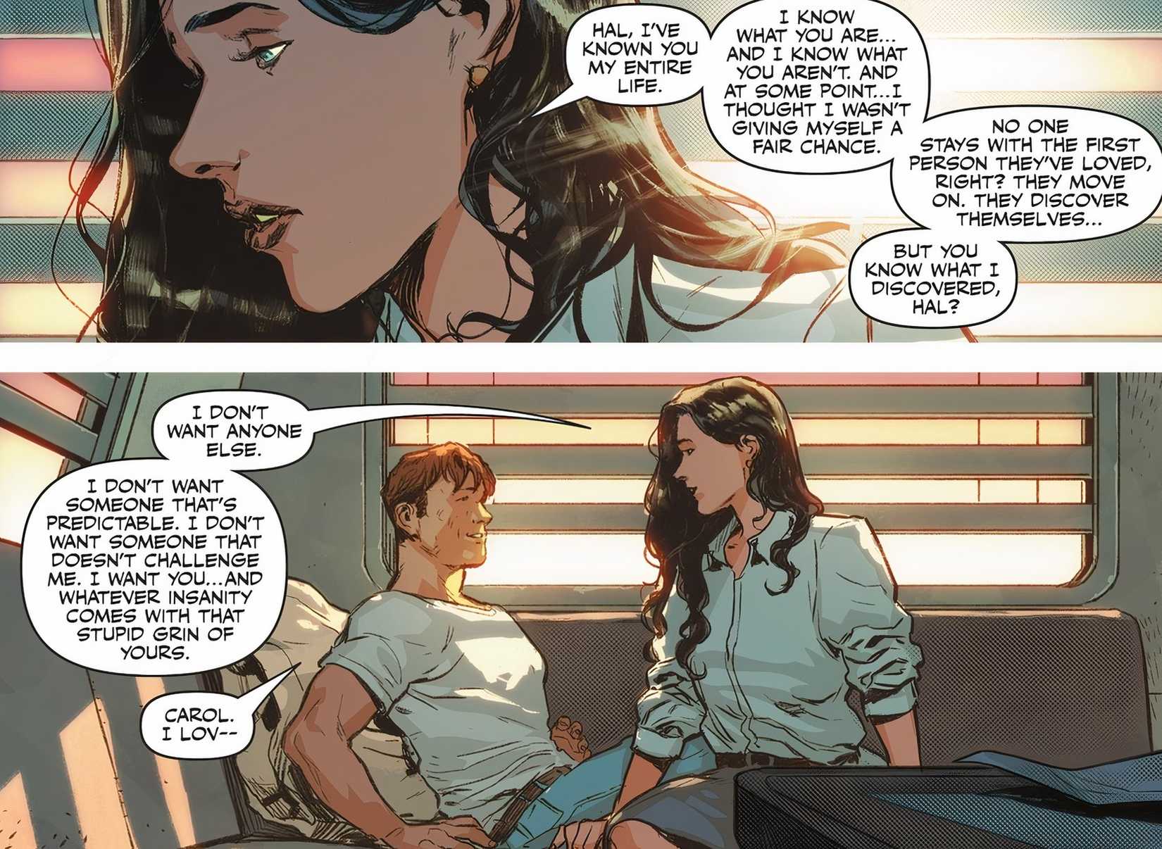 Carol lleva a Hal a su caravana para curar sus heridas. Cuando se recupera, Carol admite que Ella todavía ama a Green Lantern y quiere la aventura que él trae a su vida.Hal le corresponde su amor, pero antes de que puedan procesarlo, las fuerzas de Waller llegan para detener a Linterna Verde.