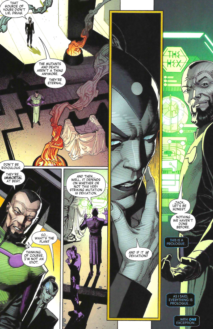 En el Día del cómic gratuito 2022: Vengadores/X-Men La historia “Of Deviation and Mutation” de Kieron Gillen y Dustin Weaver, Druig y Jack de Knives of the Eternals están discutiendo sobre los X-Men después de que Jack se infiltró en secreto en Krakoa y descubrió el secreto de la resurrección mutante. Durante una secuencia de flashback anterior en el cómic a aproximadamente un millón de años en el pasado, Druig y Uranos matan a toda una comunidad de monos mutantes que habían mostrado signos de telepatía y comenzaron a formar una mente colectiva. Dado que esa mutación se desvió demasiado del orden natural de la evolución, hubo que matar a los monos. Entonces, en la actualidad, Druig y Jack of Knives están discutiendo hacer lo mismo con la población mutante, ya que engañar a la muerte está más allá del orden natural. Mientras que los dos hablan de eliminar potencialmente a la población mutante debido a esta transgresión contra la naturaleza, hay una pantalla detrás de Druig que muestra un hexágono con las palabras “El maleficio” escritas en su interior.