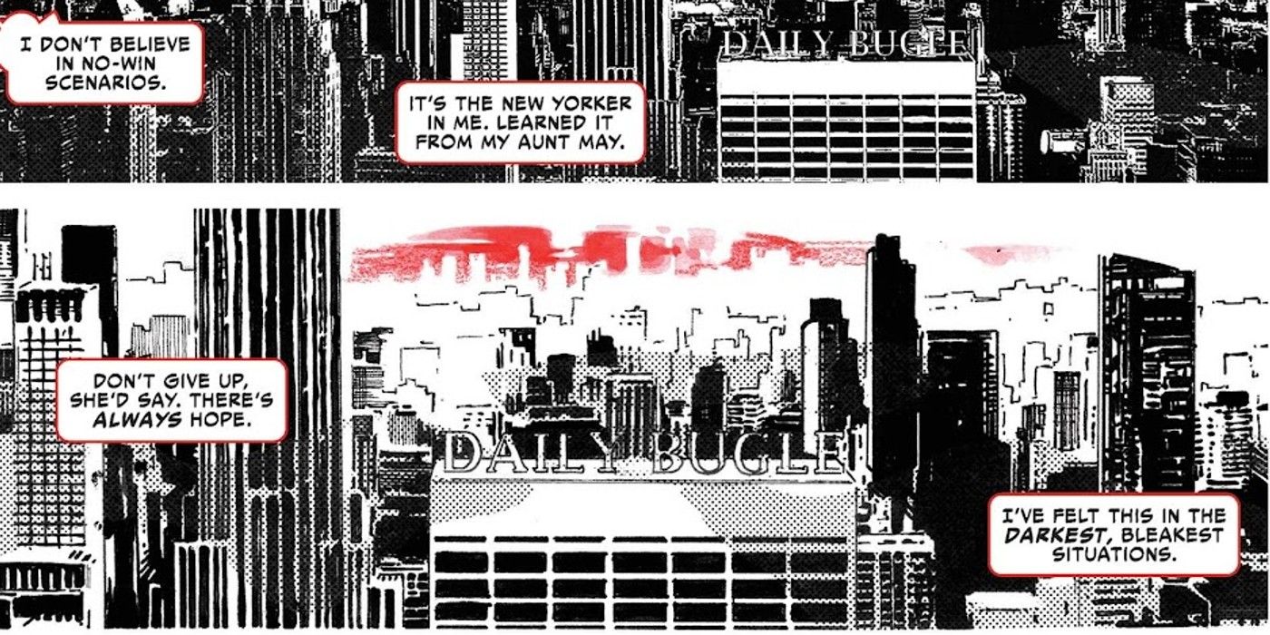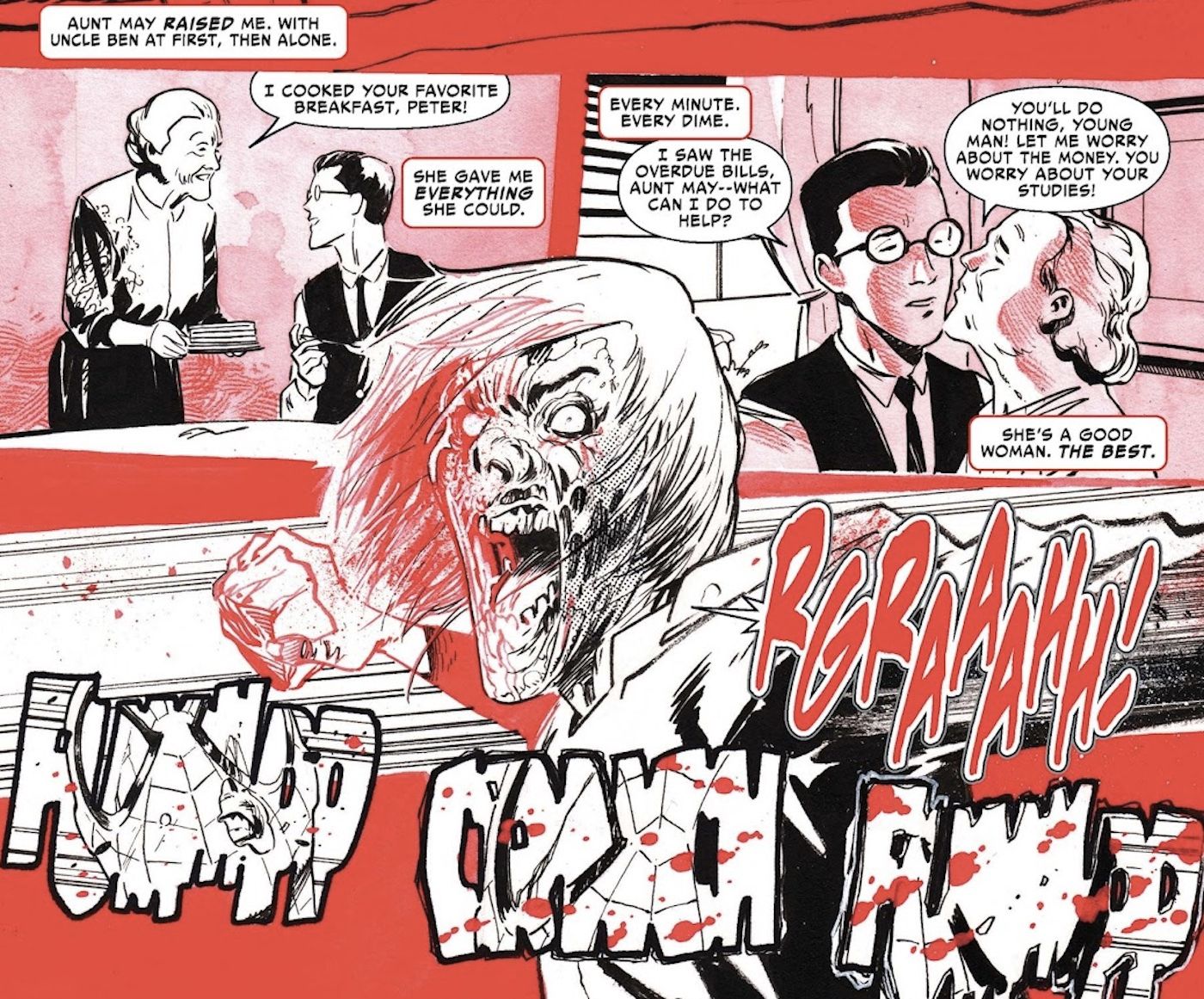 “/> La historia comienza con Peter irrumpiendo en un monólogo narrativo en el que menciona que la tía May le enseñó a nunca perder la esperanza y que no cree en escenarios sin salida. En cuanto a esta historia, poco a poco pierde esa esperanza mientras defiende el Daily Bugle de una horda de zombis, sólo para enfrentarse a una tía May zombificada. Sin embargo, el sentimiento detrás de la esperanza que ella le transmitió da una nueva perspectiva a la narrativa general de Spider-Man.