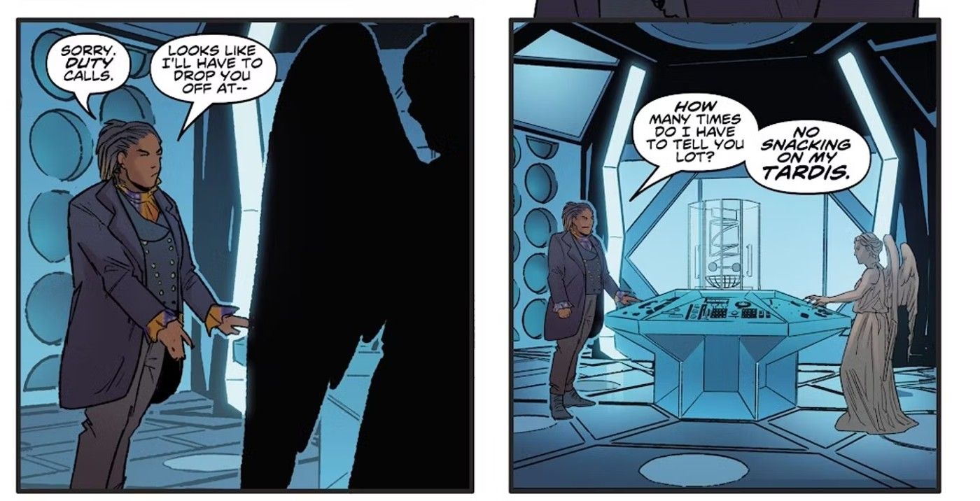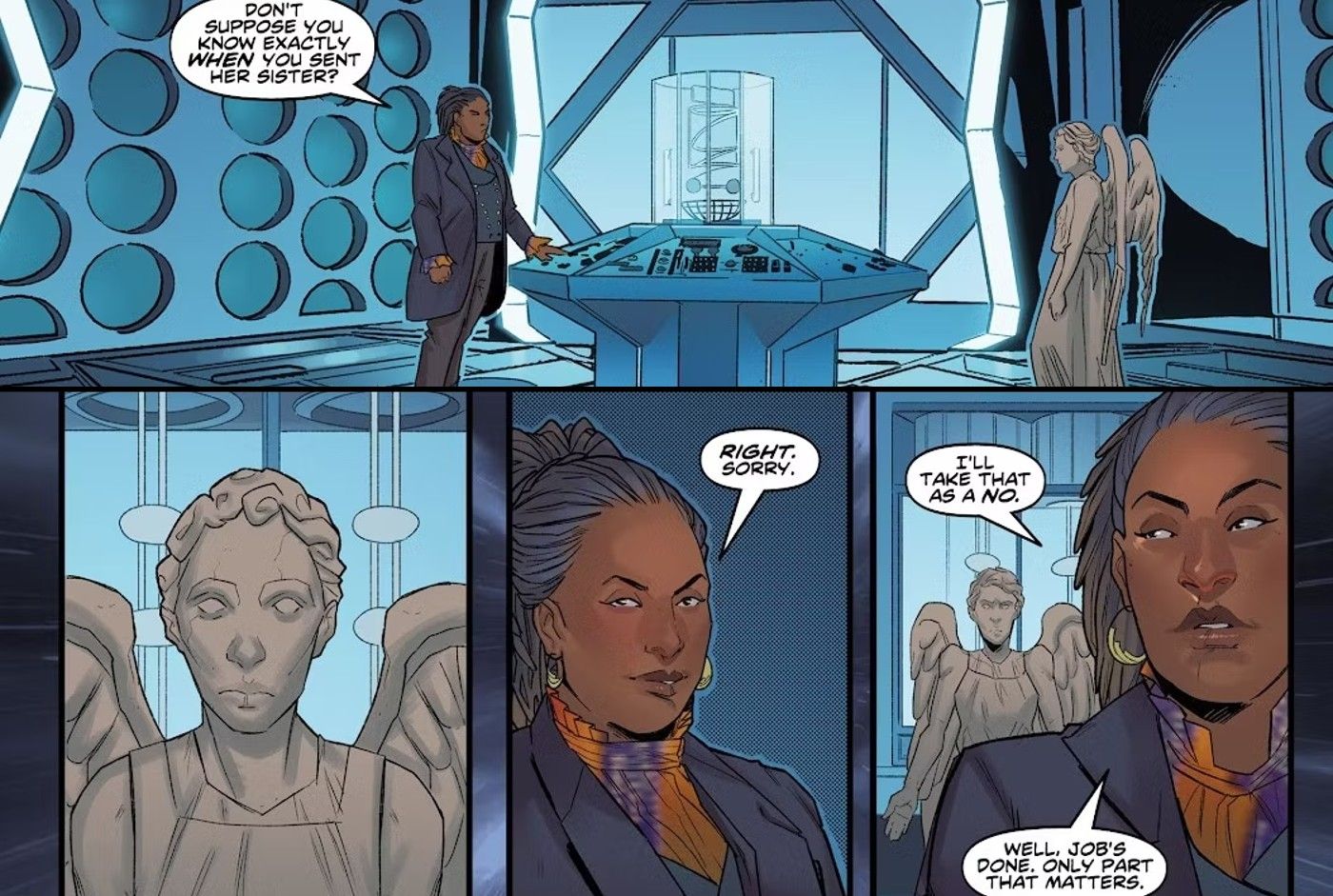 El Doctor viaja a menudo con acompañantes. En el programa de televisión, tienden a ser humanos, aunque solo sea por restricciones presupuestarias, pero los cómics a menudo representan aliados mucho más extraños, por ejemplo, el pingüino alienígena Frobisher. Tiene sentido que con menos experiencia del universo y dentro de los límites de la División, el Doctor Fugitivo confiaría y viajaría con Weeping Angels; de hecho, está implícito que ha estado en múltiples misiones con el mismo dúo. Lamentablemente, los recuerdos de la Doctora de su primera encarnación se borrarían más tarde, y las versiones futuras de la Doctora considerarían a los Ángeles primero como un mito y luego como una amenaza repugnante. Sin embargo, a pesar de su naturaleza depredadora, los Ángeles tienen algo de humanidad, algo que el Doctor sabía de primera mano.