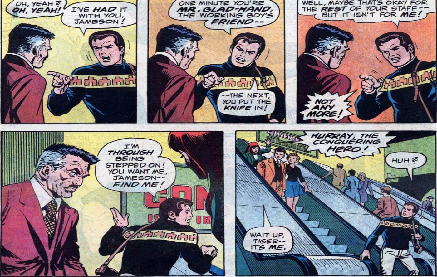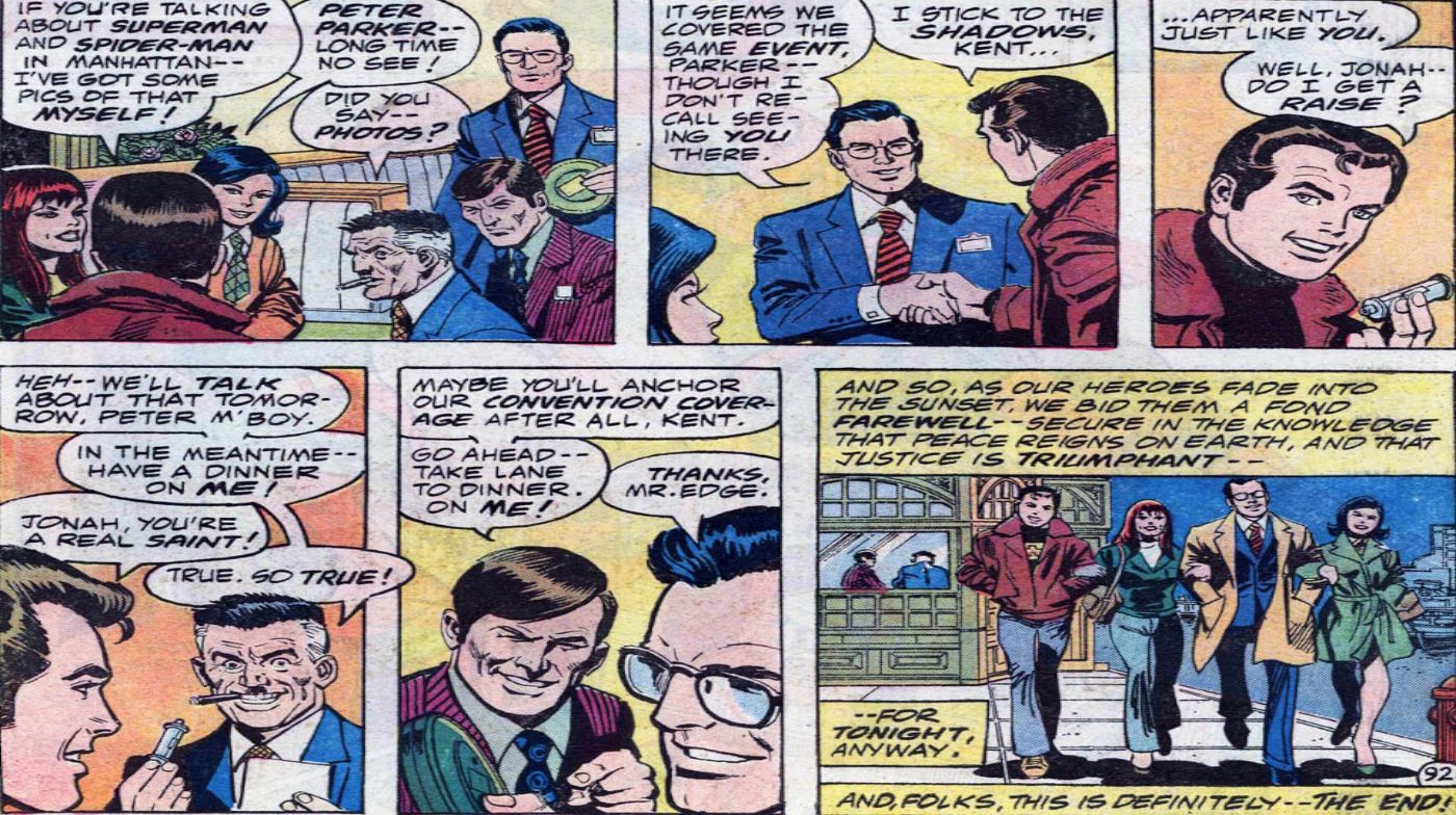 Durante uno de los muchos cruces de Marvel y DC, Superman contra el asombroso Hombre Araña de Gerry Conway, Ross Andru, Dick Giordano, Gaspar Saladino y Jerry Serpe, Clark Kent y Peter Parker terminan en la misma convención de noticias. Allí, Peter se mete en una acalorada discusión y casi abandona el Daily Bugle en el acto.