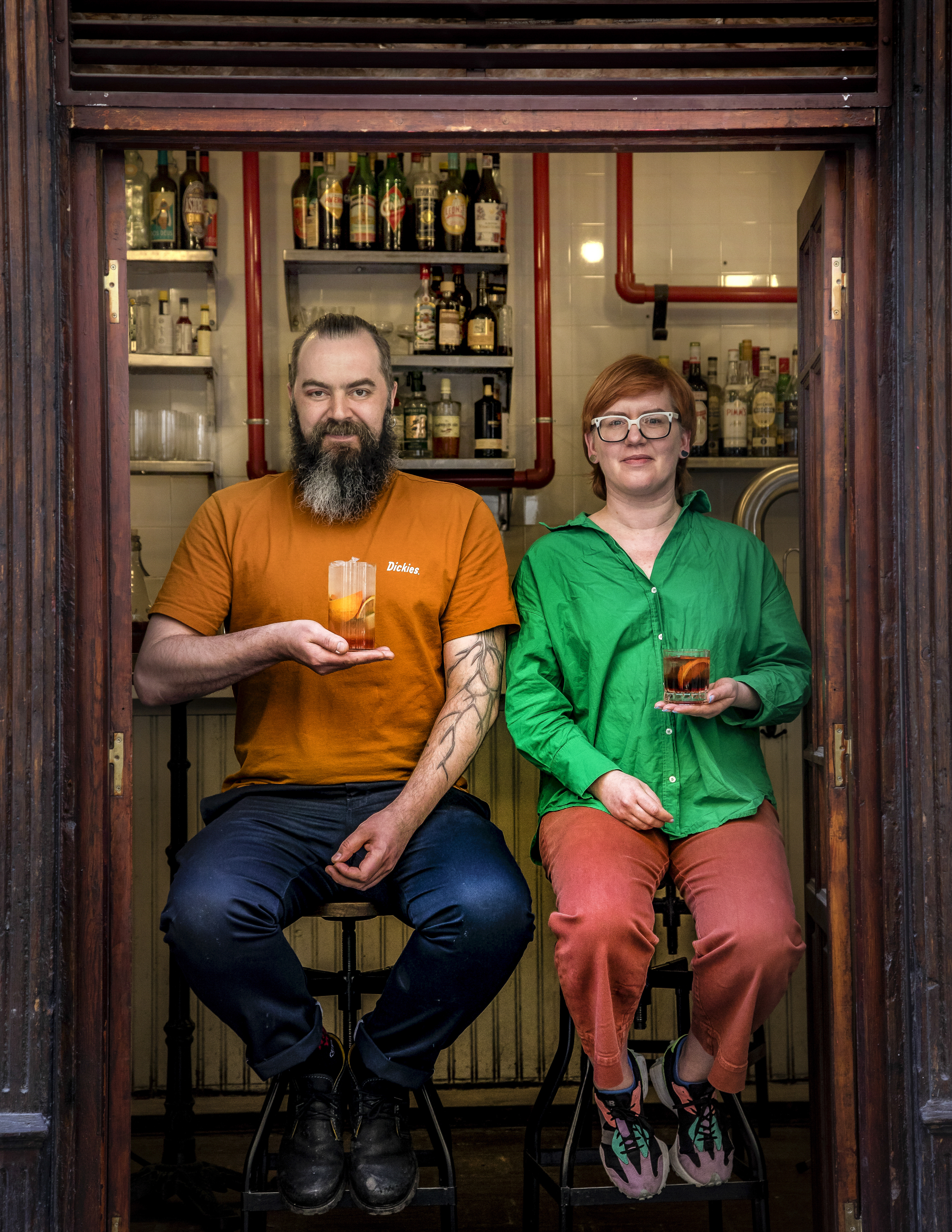 Gintas agita la coctelera mientras Dovi se apoya en la barra de su bar, Savas, en Madrid.Victoria Iglesias