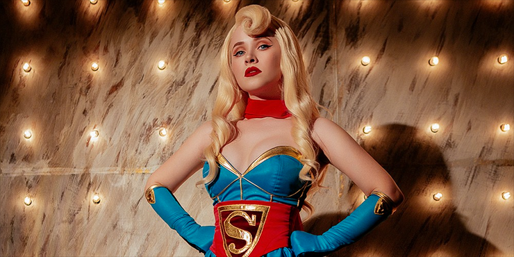 En el sitio web reddit.com, el cosplayer Astelvert creó una interpretación magnífica del atuendo vintage de Supergirl. El peinado de la década de 1940 se reproduce perfectamente aquí, junto con el azul claro de la sección base del disfraz. El escudo S característico de Supergirl se encuentra en su estómago en lugar de en su pecho, y se usa a la manera de un gran cinturón que replica a los artistas del circo. Los acentos dorados en los bordes de los guantes y el escudo S completan el look, junto con botas rojo oscuro (una llamada al propio traje de la Edad de Oro de Superman). Una banda roja alrededor del cuello de Astelvert agrega la última pieza de rojo necesaria para completar el look Bombshell Supergirl.