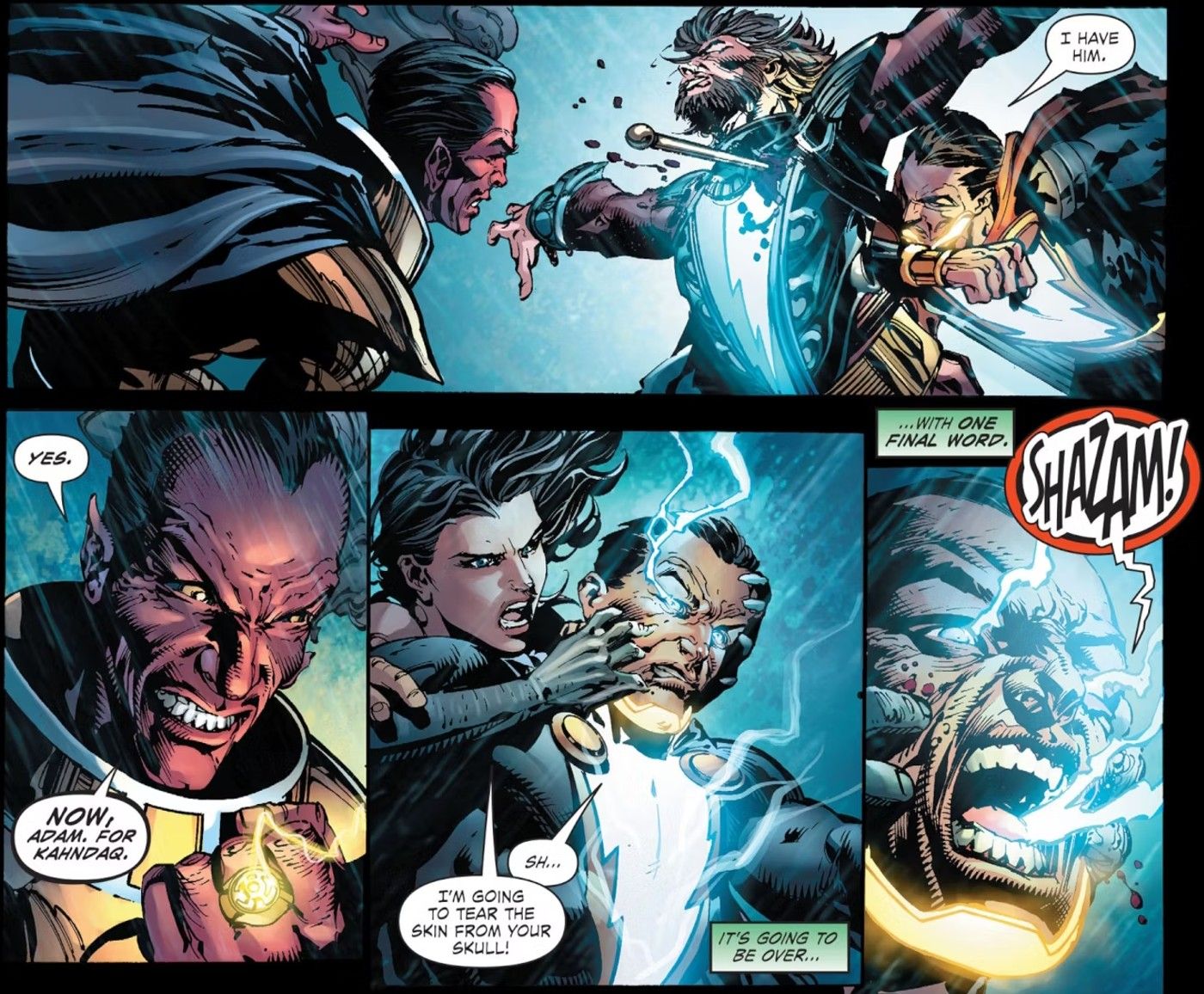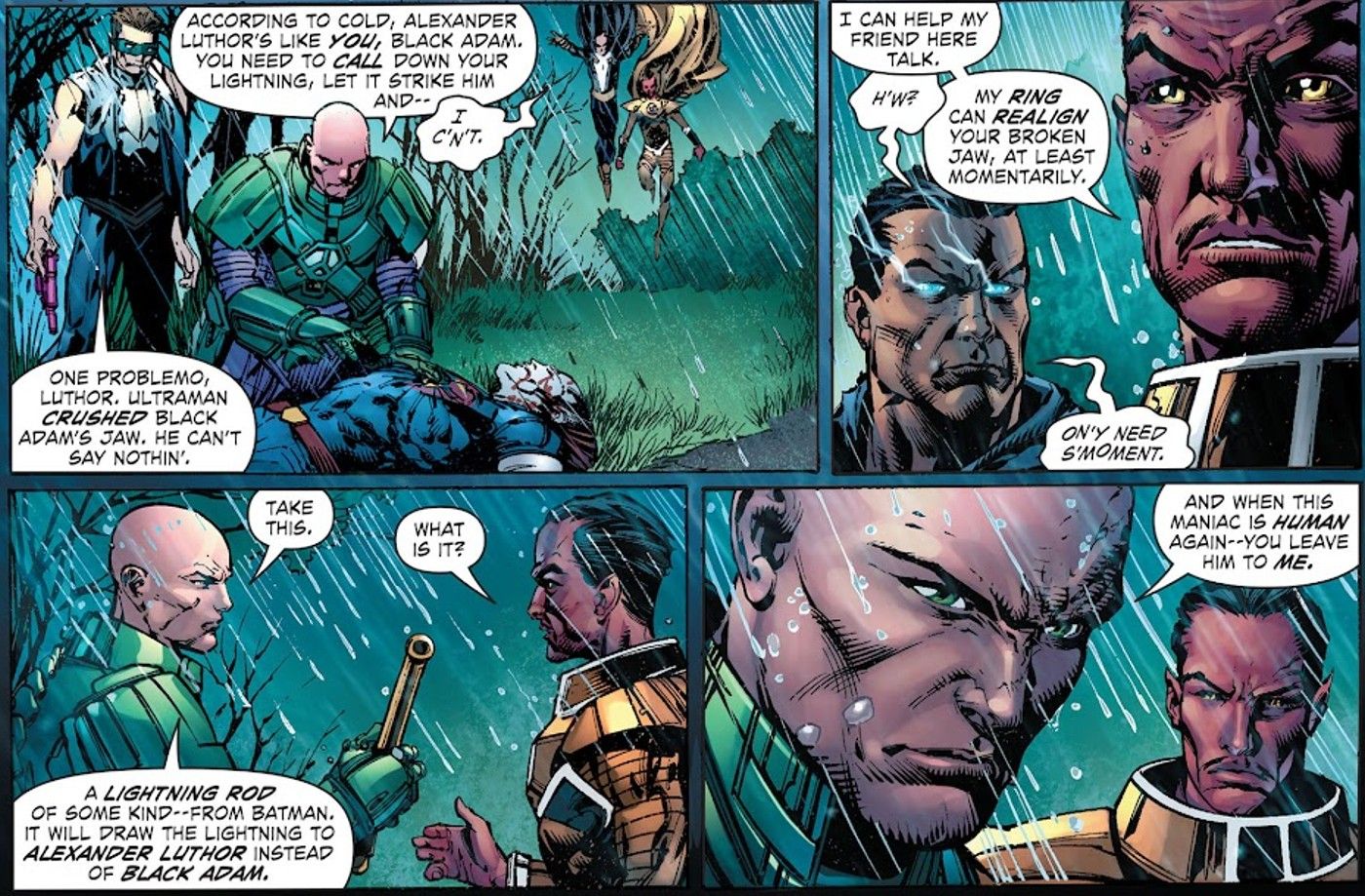 Si bien Batman tiene la intención de usar el pararrayos en este número contra la versión de Flash del Crime Syndicate, Lex Luthor se da cuenta de que podría funcionar igual de bien contra Alexander Luthor. Alexander, una versión enloquecida de Lex Luthor, roba los poderes de cualquiera que mata. Esto lo hace extremadamente peligroso, especialmente porque le roban su mayor poder a Shazam, lo que lo hace prácticamente invulnerable. En un intento por causarle daño a Alexander, Lex hace que Black Adam empuje el pararrayos hacia su enemigo y luego invoque el rayo mágico, con la esperanza de que pueda causarle un daño real a Alexander.