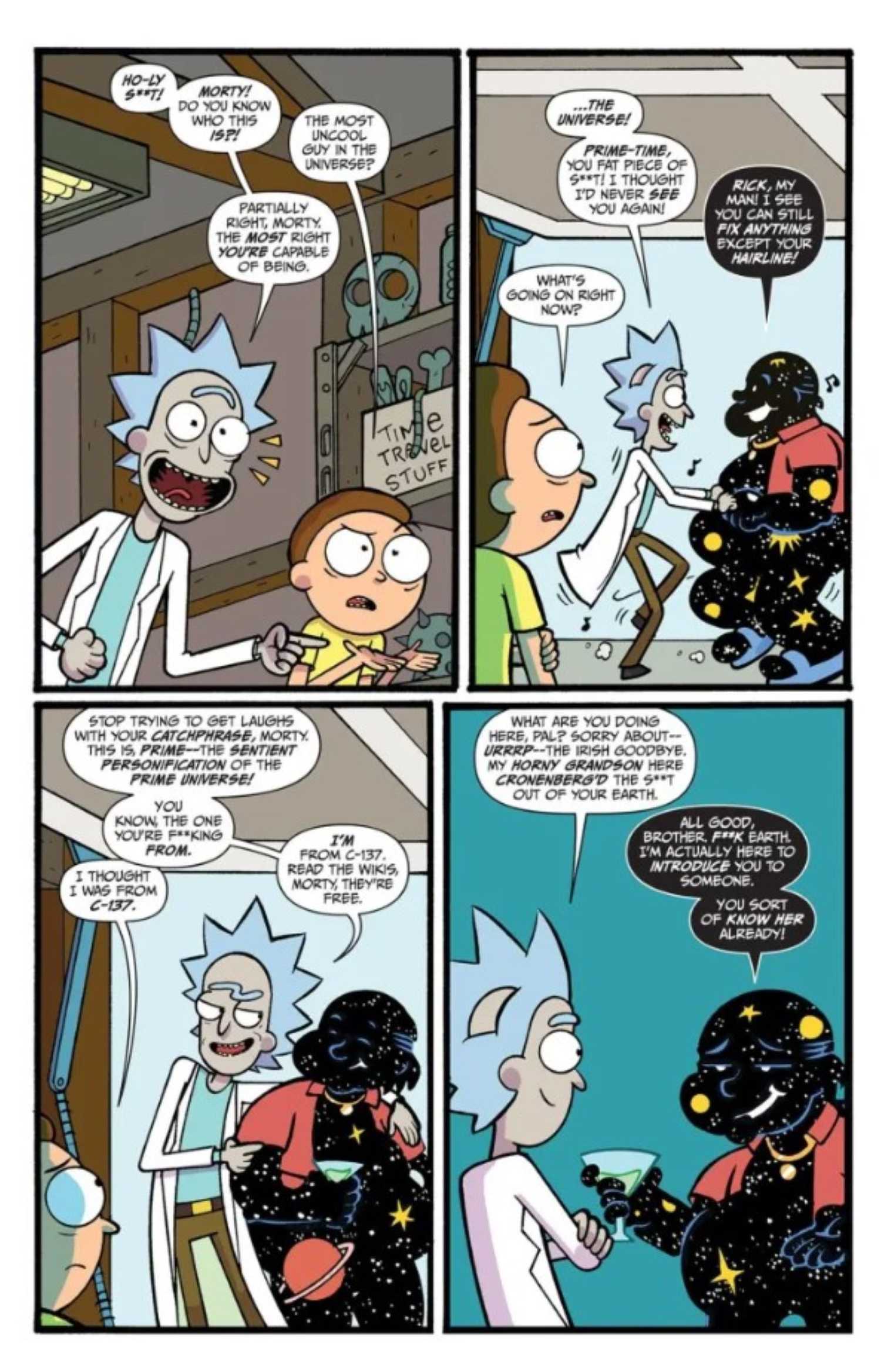 Rick y Morty contra el universo #1 comienza con Rick reuniéndose con su viejo amigo Dimension C-137. Este amigo revela que ha conocido su vida media universal y está a punto de casarse con la encarnación del presentador femenino de la dimensión parmesana. Naturalmente, quiere la mejor fiesta de soltero, y Rick está más que feliz de cumplir.