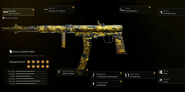 - Stock: Stock eliminado – Pros: +Velocidad de movimiento, +Velocidad de carrera para disparar, +Velocidad de apuntar hacia abajo | Contras: -Resistencia al estremecimiento, -Control de retroceso, -Precisión, -Estabilidad al caminar con el objetivo