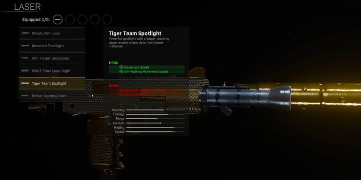 - Láser (Cuerpo): Tiger Team Spotlight – Pros: ⊕Velocidad de movimiento, ⊕Velocidad de movimiento al caminar | Contras: ⊖Linterna visible para los enemigos, ⊖Estabilidad de puntería
