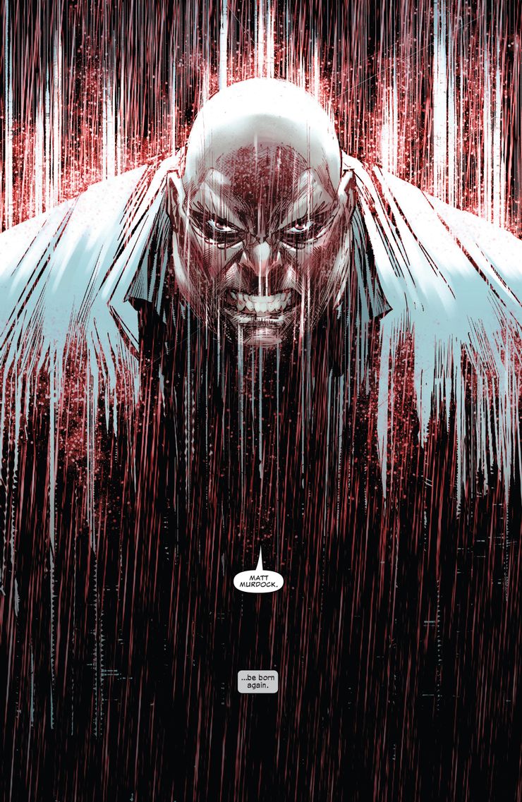 Como se mencionó anteriormente, Kingpin está usando las habilidades de manipulación mental de Killgrave para influir en el ciudadano promedio, y Kingpin enfoca el poder a través de una varita especial. Kingpin se da cuenta de que puede usar la varita para hacer que las personas recuerden eventos y personas que habían sido borradas de su memoria. Armado con este conocimiento, Kingpin corre bajo la lluvia, deseando recordar la identidad secreta de Daredevil. A medida que los recuerdos de Kingpin regresan, a medida que se le quita el peso, lo compara con ser “consumido” como un fénix, solo para “nacer de nuevo”. La mirada en el rostro de Kingpin al final es de pura ira y pura determinación, dejando al lector con la impresión de que las cosas están a punto de empeorar antes de mejorar.