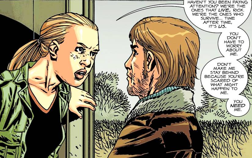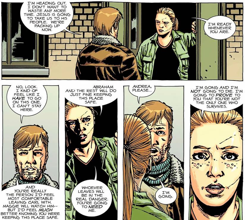 Aunque dio lugar a una gran historia de amor, La escena de Los muertos vivientes #94 que precipitó el inicio del romance de Andrea y Rick es una confrontaciónmientras Rick intenta anteponer su creciente deseo de proteger a Andrea a los mejores intereses de su grupo. Cuando Rick intenta encontrar un pretexto para evitar que ella se embarque en una misión peligrosa, Andrea lo reprende con enojo. Ella declara:
