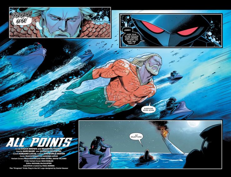 Aunque Aquaman y Black Manta luchan por trabajar juntos, la asociación entre los dos llega a su fin en Aquamen #5 por Sami Basri, Brandon Thomas y Chuck Brown. Mientras Aquaman lidera las fuerzas de Black Manta en todo el mundo para reparar el daño causado por los agentes durmientes rebeldes, el propio Black Manta tiene la tarea de rastrear y tratar con Scavenger. Black Manta confirma la ubicación del villano, pero cuando la pelea con Scavenger se vuelve amarga, Arthur aparece justo a tiempo. En un brillante equipo de etiqueta, Aquaman lanza una de las motos de agua de Manta directamente hacia Scavenger, y Manta detona rápidamente el vehículo de forma remota para terminar la pelea.