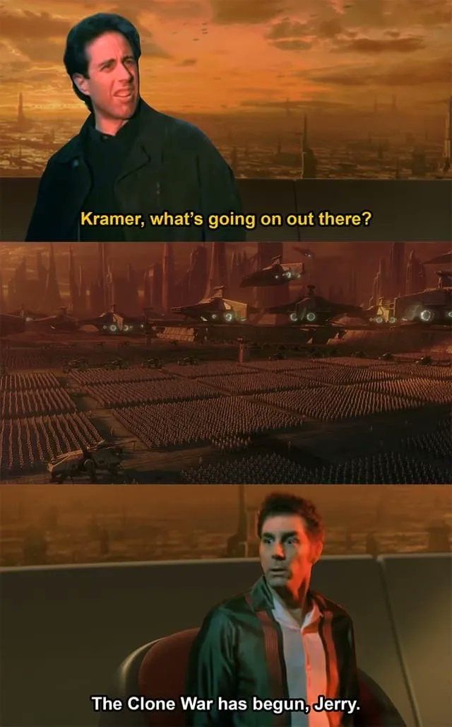 Ahora, parece que el meme por fin ha llegado al Guerra de las Galaxias universo. Guerra de las Galaxias comunidad de fans, El inframundo de Star Wars, publicó recientemente una nueva versión del meme en Twitter.. El meme se muestra en tres paneles, que representan a Jerry y Kramer en el planeta Coruscant. El primer panel muestra a Jerry luciendo confundido y preguntando “Kramer, ¿qué está pasando ahí fuera?” El siguiente panel muestra la famosa escena de finales de El ataque de los clones, en el que se muestra a los clones preparándose para la batalla en masa. El meme termina con Kramer respondiendo: “La Guerra de los Clones ha comenzado, Jerry”. Esto, por supuesto, es una referencia hilarante a la línea final de Yoda en la película. Mira el meme a continuación: