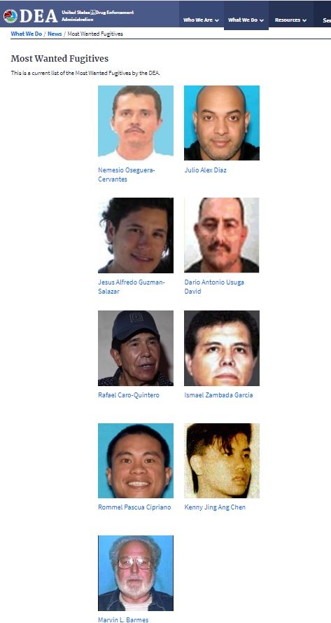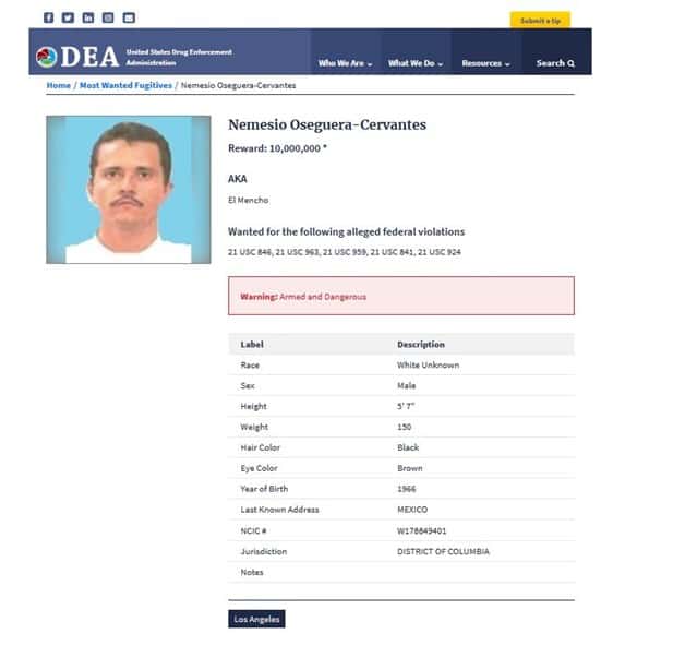Washington.- La Administración para el Control de Drogas de Estados Unidos, (DEA, por sus siglas en inglés), actualizó hoy en su sitio web que el narcotráficante Nemesio Oseguera Cervantes, alias “El Mencho”, es el fugitivo más buscado por este organismo.