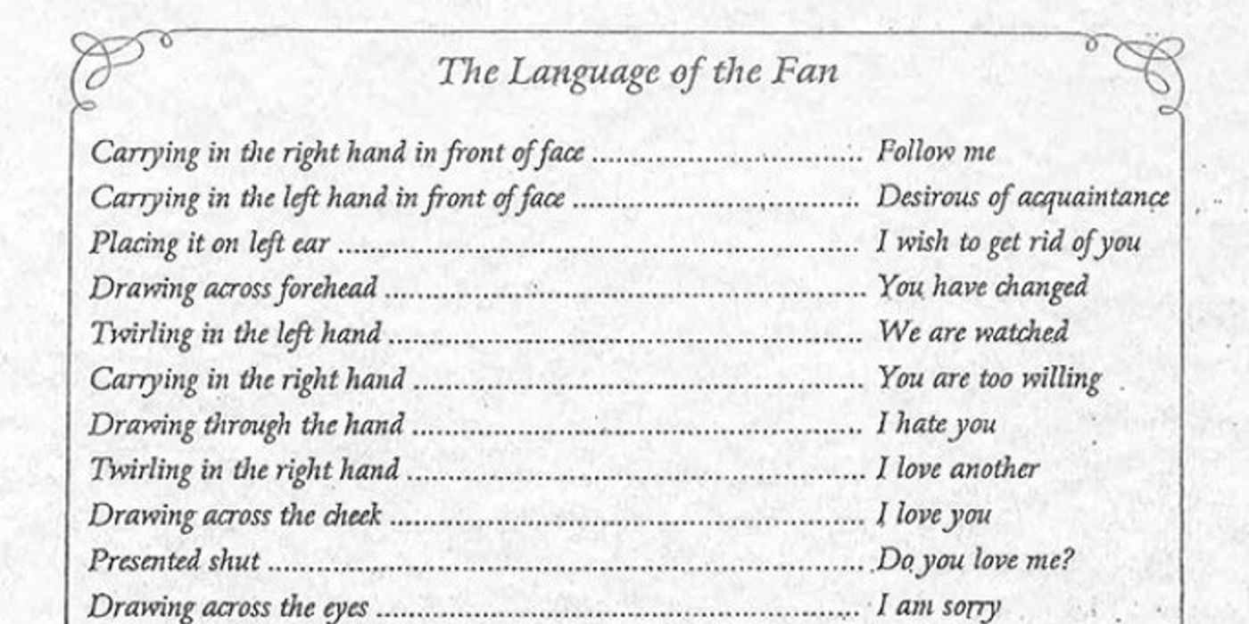 Los fanáticos se utilizaron por razones tanto prácticas como sociales en la Inglaterra del siglo XIX bajo el gobierno de la reina Victoria. Útiles para mantener frescas a las damas con corsés y alejar a los molestos insectos, los abanicos también se utilizaban para coquetear, y La elegancia con la que una dama sostenía y usaba un abanico era una señal de su estatus en la sociedad educada.. Incluso antes de que Duvelleroy imprimiera su folleto “El lenguaje del abanico”, el diseñador de estampados de abanicos Charles Francis Badini inventó la “fanología” al designar letras del alfabeto para movimientos corporales específicos combinados con la ubicación de los abanicos. A cada letra se le designaban dos señales, y tanto deletrear como recibir mensajes habrían sido tareas tediosas.