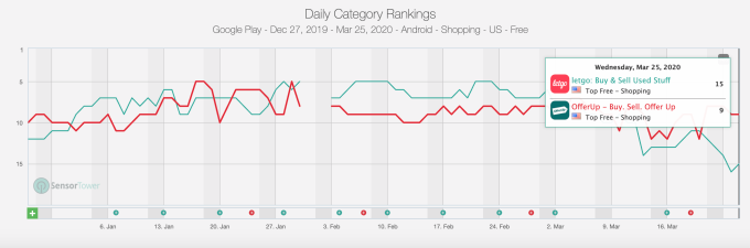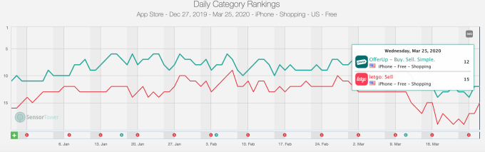 Déjalo ir trae a la mesa una aplicación con más de 100 millones de descargas en todo el mundo, por lo que existe el potencial de reactivar a algunos de los usuarios caídos que actualmente no están comprando o vendiendo en su mercado hoy. Las dos aplicaciones a menudo estaban codo con codo en términos de sus clasificaciones de categoría de tienda de aplicaciones, aunque en iPhone OfferUp ha mantenido una ligera ventaja. (Consulte los cuadros de la App Store y Google Play a continuación).