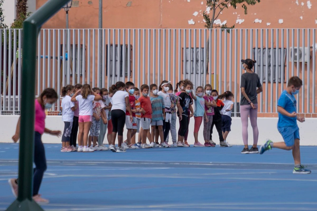 Alumnos del colegio Raimundo Lulio en Camas (Sevilla), usan mascarilla en exterior durante una clase de Educación Física.