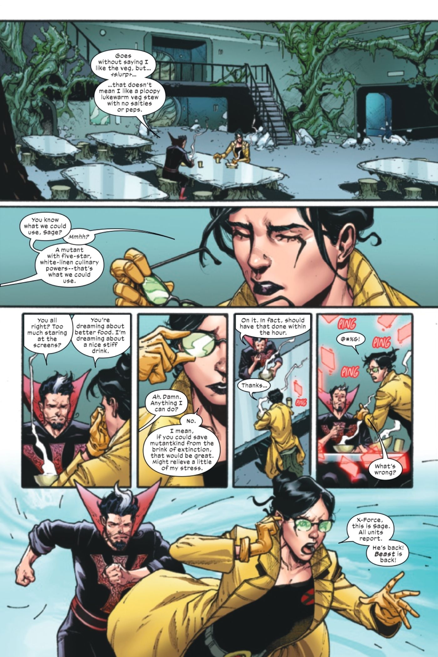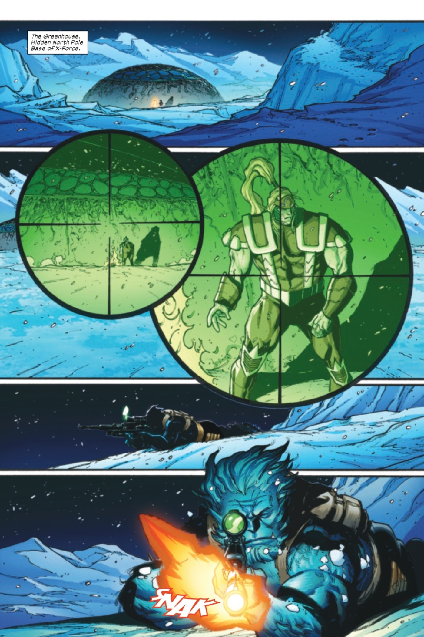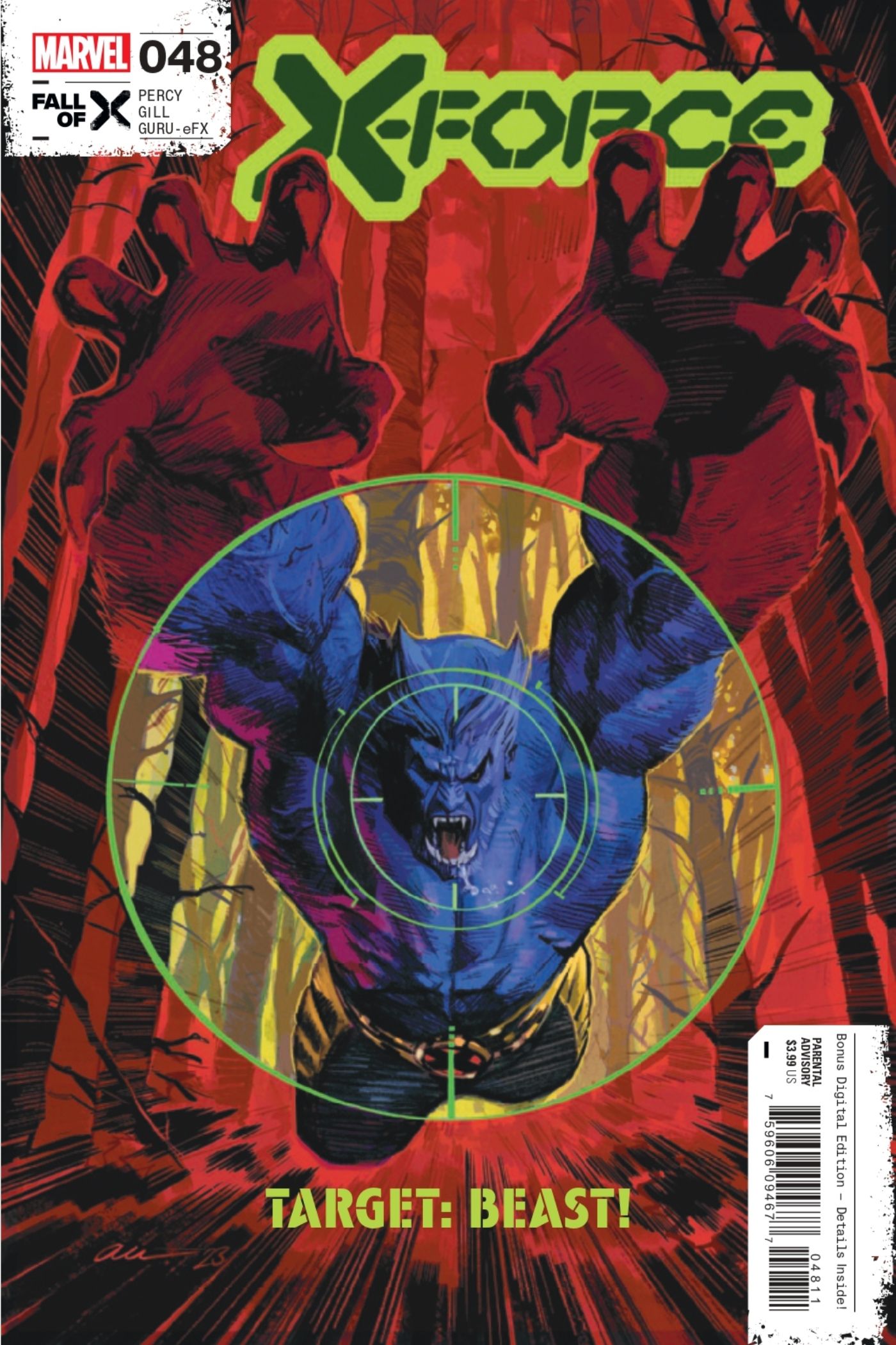 La vista previa para Fuerza X El número 48 de Benjamin Percy y Robert Gill revela que este número continúa justo donde lo dejó el anterior. Beast ha rastreado con éxito a X-Force hasta su base secreta en el Polo Norte conocida como Greenhouse, y los está observando a través de la mira de su rifle de francotirador. Cuando tiene a Omega Red a la vista, solo, Beast aprieta el gatillo. En lugar de simplemente ser eliminado momentáneamente, el impacto de esta arma en realidad derriba a Omega Red indefinidamente, lo cual es impactante debido a su conocido factor de curación.