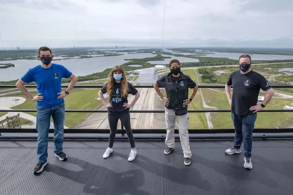 Jared Isaacman, fundador y director ejecutivo de Shift4 Payments, de 38 años, ha financiado los tres pasajes de Hayley Arceneaux, de 29 años, superviviente de un osteosarcoma diagnosticado en el Hospital de Investigación Infantil St. Judeen cuando tenía diez años y ahora médica asistente del mismo hospital (será la persona más joven en volar al espacio orbital); la profesora universitaria Sian Proctor y el ingeniero aeroespacial y veterano de la Fuerza Aérea Chris Sembroski. Los dos últimos consiguieron su plaza en sendos sorteos: uno entre donantes al hospital y otro, entre clientes de las empresas de Isaacman. Todos son declarados fanáticos del vuelo tanto atmosférico como espacial. Los cuatro constituyen la primera tripulación integrada solo por personal civil.