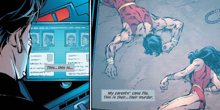 Tenga en cuenta que durante años hasta este punto, el asesinato de los padres de Dick parecía ser un caso abierto y cerrado que lo presentó como el pupilo de Batman. Desde la introducción de Robin en Detective Comics # 38 por Bill Finger y Bob Kane, ha sido aceptado en Batman Sabe que el jefe de la mafia, Anthony Zucco, ordenó a su mejor hombre, Blade, sabotear las cuerdas de los Flying Graysons para hacer que su asesinato pareciera un accidente. Dick escuchó una conversación incriminatoria entre Blade y Zucco que parecía confirmar su participación. Además, después de una violenta persuasión del Caballero de la Noche original, Blade escribió una confesión sobre sus crímenes y los de Zucco. Zucco mató a Blade tras el descubrimiento y tanto la confesión como el asesinato de Blade se utilizaron para condenar a Zucco.