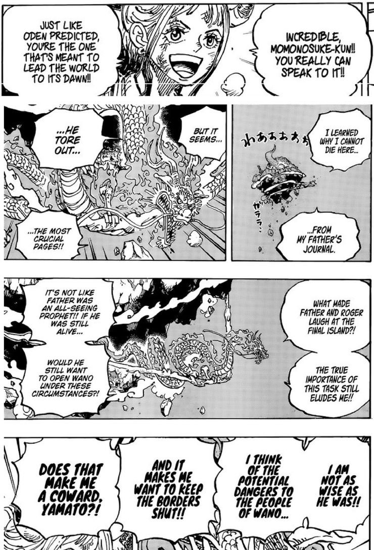 El capítulo 1041 comienza con Momonosuke, en su forma de dragón, hablando con Yamato, el hijo de Kaido que se unió al levantamiento contra su padre. Tanto Momo como Yamato leen los diarios de Oden, por lo que conocen información que los lectores aún no conocen. Yamato dice que Momo es “el que está destinado a llevar al mundo a su amanecer“, tal como predijo Oden. Teniendo en cuenta que Oden estaba esperando el regreso de Joy Boy, era posible que Momo fuera el mismo Joy Boy, pero el final del capítulo 1043 apunta hacia Luffy. La conexión entre los dos se confirma por el hecho de que ellos son los únicos que pueden hablar con Zunesha, el antiguo compañero de Joy Boy. Cuando los Piratas de Sombrero de Paja conocieron a Zunesha, el lugarteniente de Kaido, Jack, lo atacó. El elefante no podía actuar por su cuenta debido a la expiación por su pecado pasado. y le rogó a Momonosuke que le diera la orden de defenderse. Ahora, Zunesha ha llegado a Wano para ayudar a Momo en su batalla, y después de que Luffy es derrotado por Kaido, siente que Joy Boy finalmente ha despertado.
