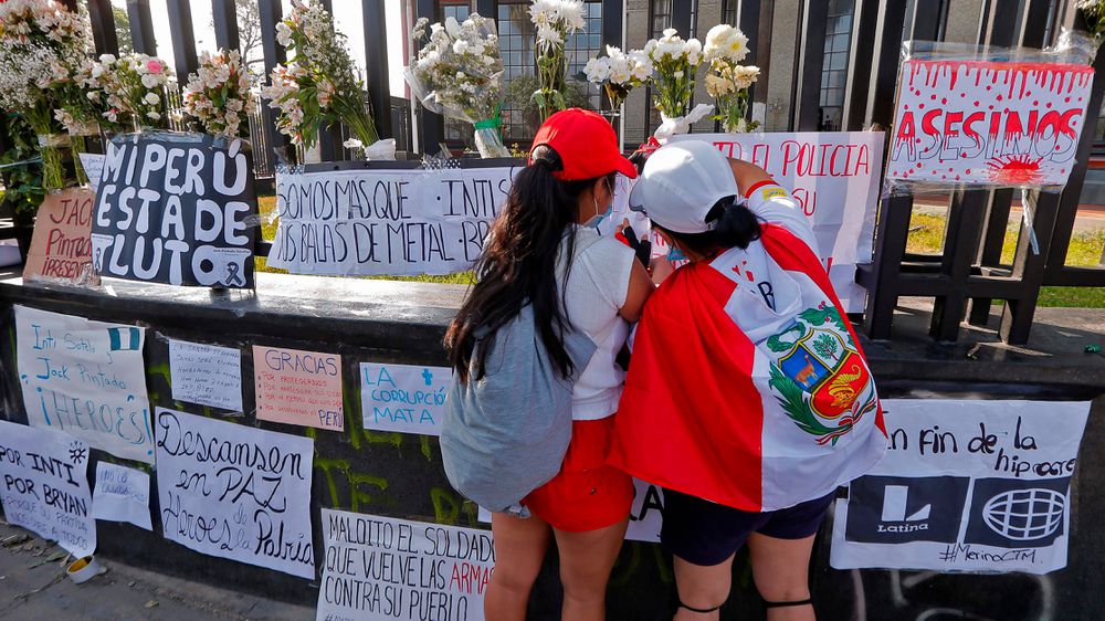 Un par de mujeres en un homenaje a las víctimas mortales durante las protestas en Lima, Perú.