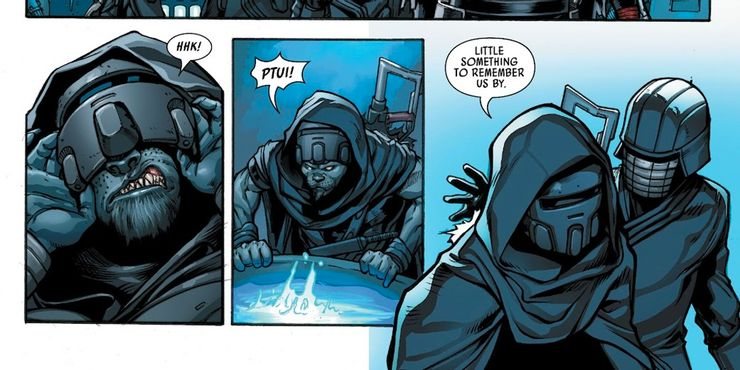 En Guerra de las Galaxias: Reinado carmesí # 4 por Charles Soule, Steven Cummings, Victor Olazaba y Gure-eFX, los Caballeros están en el castillo de Darth Vader y escupen en su tanque de curación de bacta. No solo es un momento extraño y asqueroso, sino que es uno de los raros momentos en que Guerra de las Galaxias echa un vistazo a la dignidad de Vader. Esto es extraño, porque la franquicia generalmente tiene al Lord Sith en la más alta consideración, para que no socaven la amenaza y el simbolismo que representa. Sin embargo, esto es exactamente lo que hace que los Caballeros de Ren sean únicos, ya que no les importa la imagen de Vader. Como se mencionó anteriormente, Vader y el resto de los Sith solo se interponen en el camino del deseo del Caballero de saquear y hacer lo que quieren.