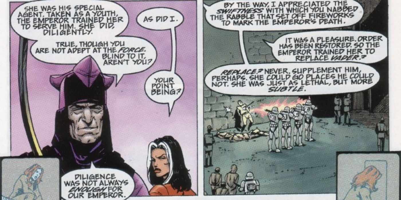 En el Leyendas cómic Star Wars: Mara Jade – De la mano del Emperador #3 por Timothy Zahn, Michael A. Stackpole y Carlos Ezquerra, los lectores pueden echar un vistazo a la Guerra de las Galaxias galaxia inmediatamente después del asesinato del Emperador Palpatine y la destrucción de la Estrella de la Muerte. Si bien su líder estaba muerto y su arma definitiva fue destruida, el Imperio todavía estaba casi en pleno funcionamiento y la transferencia de poder ya estaba en marcha, ya que el Gran Almirante Thrawn regresaba de las Regiones Desconocidas para tomar el mando como el Heredero de el imperio. Sin embargo, hasta el regreso de Thrawn, los restos del Imperio en todos los planetas de la galaxia necesitaban actuar rápido para mantener su control a la luz de la victoria de la Rebelión. Entonces, cualquier persona que disparó fuegos artificiales para marcar la muerte del Emperador fue arrestada y luego asesinada rápidamente por un pelotón de fusilamiento.