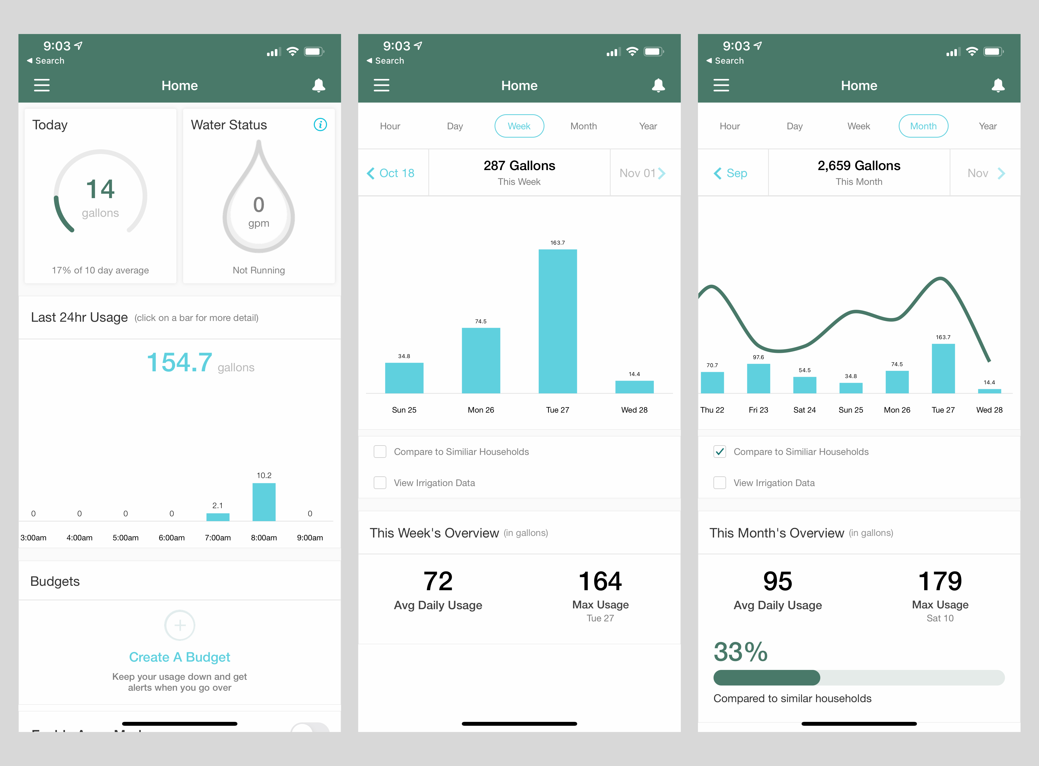 El monitor Flume proporciona información actualizada sobre el uso de agua de toda su casa, incluido cualquier consumo de grifos, plomería y accesorios interiores o exteriores. Puede alertarlo cuando detecta presuntas fugas en función del comportamiento del agua y ayudarlo a presupuestar el uso del agua si está buscando ahorrar en su factura de servicios públicos o simplemente conservar más agua mediante un uso más eficiente.