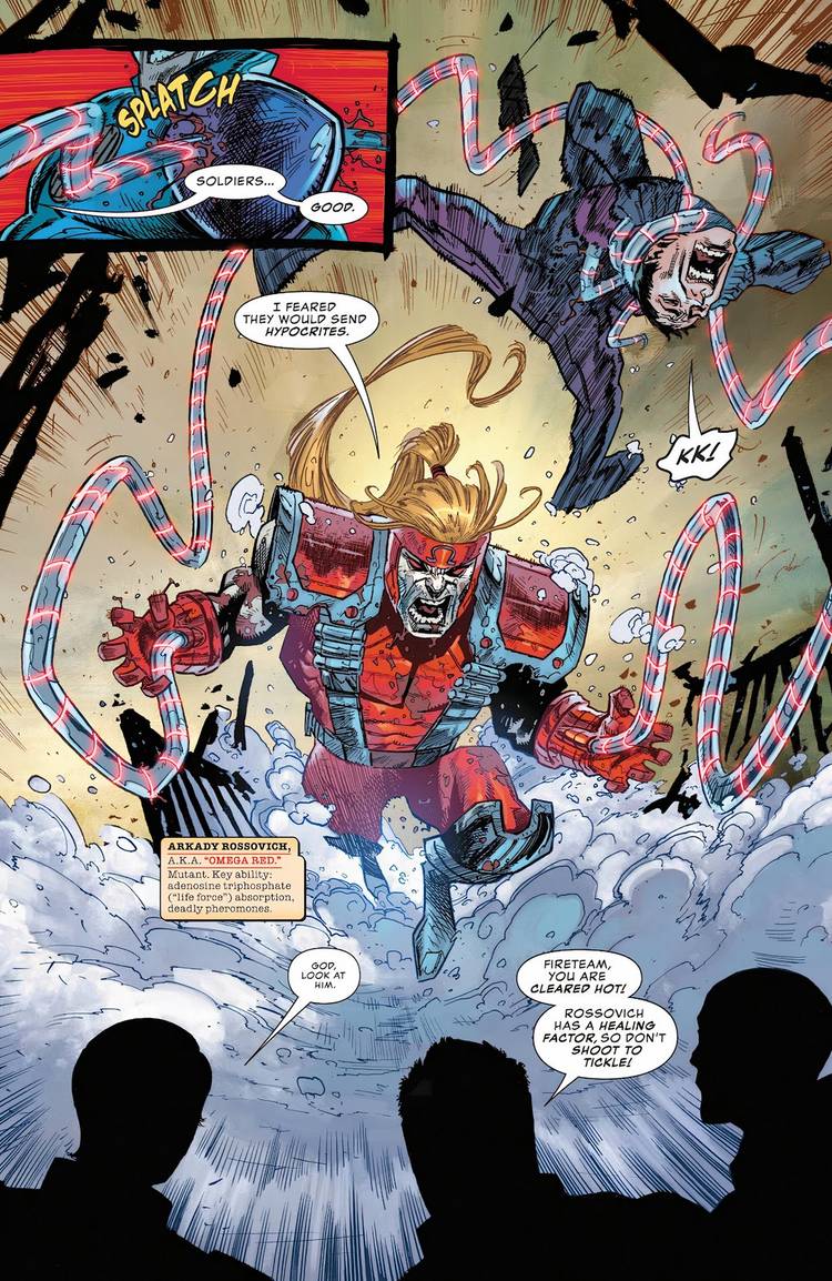 centinelas #1, del escritor Alex Paknadel con los artistas Justin Mason y Federico Blee, ve un equipo de nuevos híbridos humano-Sentinel bajo el mando de Lawrence Trask enviado tras Arkady. Un archivo interno que detalla las habilidades de Omega Red afirma que su absorción de fuerza vital en realidad drena el trifosfato de adenosina.o ATP, un compuesto bioquímico del mundo real que respalda una serie de sistemas clave en las células vivas.