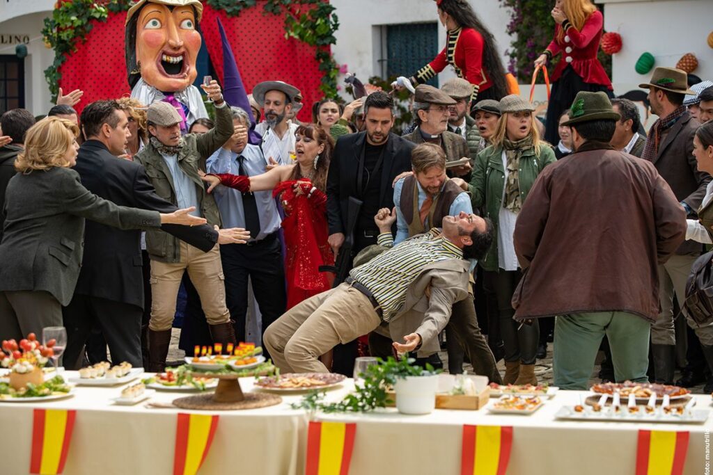 Los objetivos, explícitos incluso en uno de los diálogos, con la aparición del inequívoco y personalísimo término “austrohúngaro” como homenaje, parecen los de componer La escopeta nacional de 2022, fusionada con el espíritu de sacar el dinero a los americanos de ¡Bienvenido, mister Marshall!, aunque esta vez con la vista puesta no en ellos sino en los que ahora parecen manejar el planeta y la pasta: los chinos. Ahí están la finca de los marqueses en Toledo, la cacería con la presencia de un ministro socialista, de representantes de los diferentes partidos, de la Iglesia, del dinero, de las corruptelas, del desbarre, de los caraduras, de la lujuria, de la Guardia Civil y hasta de la España del lenguaje inclusivo, la eterna división de la izquierda y la cada vez menos disimulada actitud de los nostálgicos del régimen franquista. Por querer ser berlanguiano, Sánchez incluso basa su puesta en escena en la utilización de los planos secuencia repletos de gente, con todos hablando al mismo tiempo. Con lo difícil que es eso.