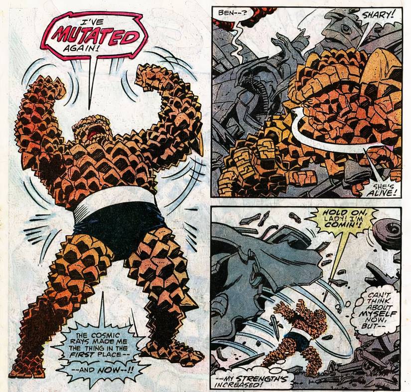 Sin embargo, después de que la estación espacial es destruida, el cohete pierde potencia y la Cosa se estrella contra la Tierra. Pero, antes de caer a través de la atmósfera, el cohete atraviesa una nube de radiación cósmica, tal como lo experimentaron los Cuatro Fantásticos originales cuando obtuvieron sus poderes. Esta radiación adicional mutó aún más a la Cosa, a medida que de su cuerpo brotaban más piedras dentadas a través de su piel rocosa, su forma física se hizo un poco más grande y se volvió aún más fuerte de lo que ya era. En otras palabras, este segundo viaje a través de rayos cósmicos hizo que la Cosa fuera más poderosa que nunca.
