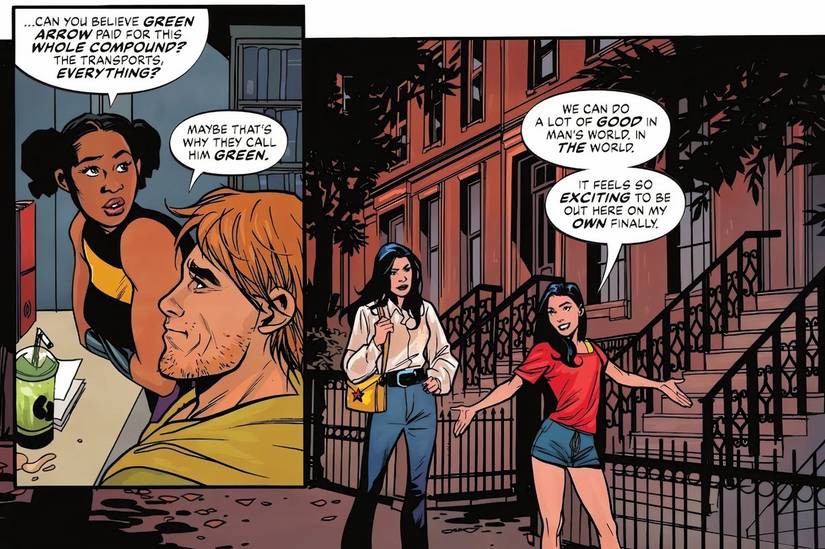 Durante la conversación entre Karen y Charly, Karen expresa su incredulidad y asombro por el hecho de que Green Arrow sea el benefactor de los Jóvenes Titanes, y señala cómo ha financiado todo su complejo y ha proporcionado todo lo que los jóvenes héroes podrían necesitar. En respuesta, Charly bromea: “Quizás por eso le llaman Verde”. Esta observación hace referencia directa al color verde de los billetes de dólar estadounidense.lo que sugiere que “Verde” El nombre de Green Arrow hace referencia al dinero. La declaración de Charly destaca la inmensa riqueza de Oliver, subrayando su condición de uno de los héroes más ricos del Universo DC y multimillonario.
