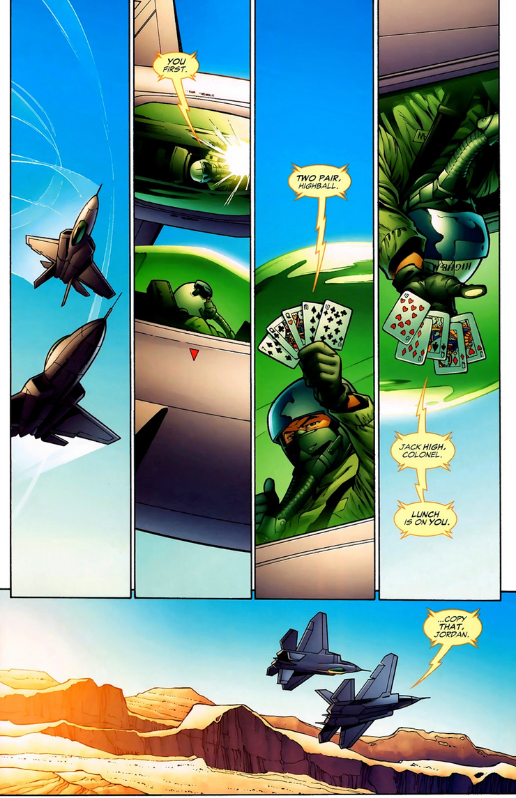 Hal ya no necesita volar aviones físicos ahora que puede volar por el aire (e incluso por el espacio) con facilidad usando su anillo. Como tal, su indicativo rara vez se usa cuando actúa como un superhéroe. Sin embargo, Hal Jordan, el más famoso Linterna Verde, tiene un indicativo con muchos significados ocultos que vinculan al personaje con su pasado y el pasado del superhéroe en general.