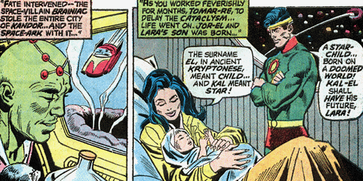 Elliot Maggin, Neal Adams, Dick Dillin y Dick Giordano’s ‘The Fabulous World of Krpyton: The Greatest Green Lantern of All’ – de 1972 Superhombre #257 – revela el nombre del joven Kal-El. La historia ve Linterna Verde Tomar-Re llevado ante los Guardianes del Universo al borde de su retiro del Cuerpo. Reconocen que previeron la destrucción de Krypton pero, debido a las restricciones de la cultura kryptoniana, no pudieron evacuar el planeta. Sin embargo, admiten que tenían sus ojos puestos en Jor-El y Lara Lor-Van, anticipando que producirían una progenie notable. En medio de este recuento, los fanáticos ven a Lara sosteniendo a su recién nacido y nombrándolo, luego de lo cual Jor-El declara que a pesar de haber nacido en un planeta condenado, su hijo “tendrá su futuro”.