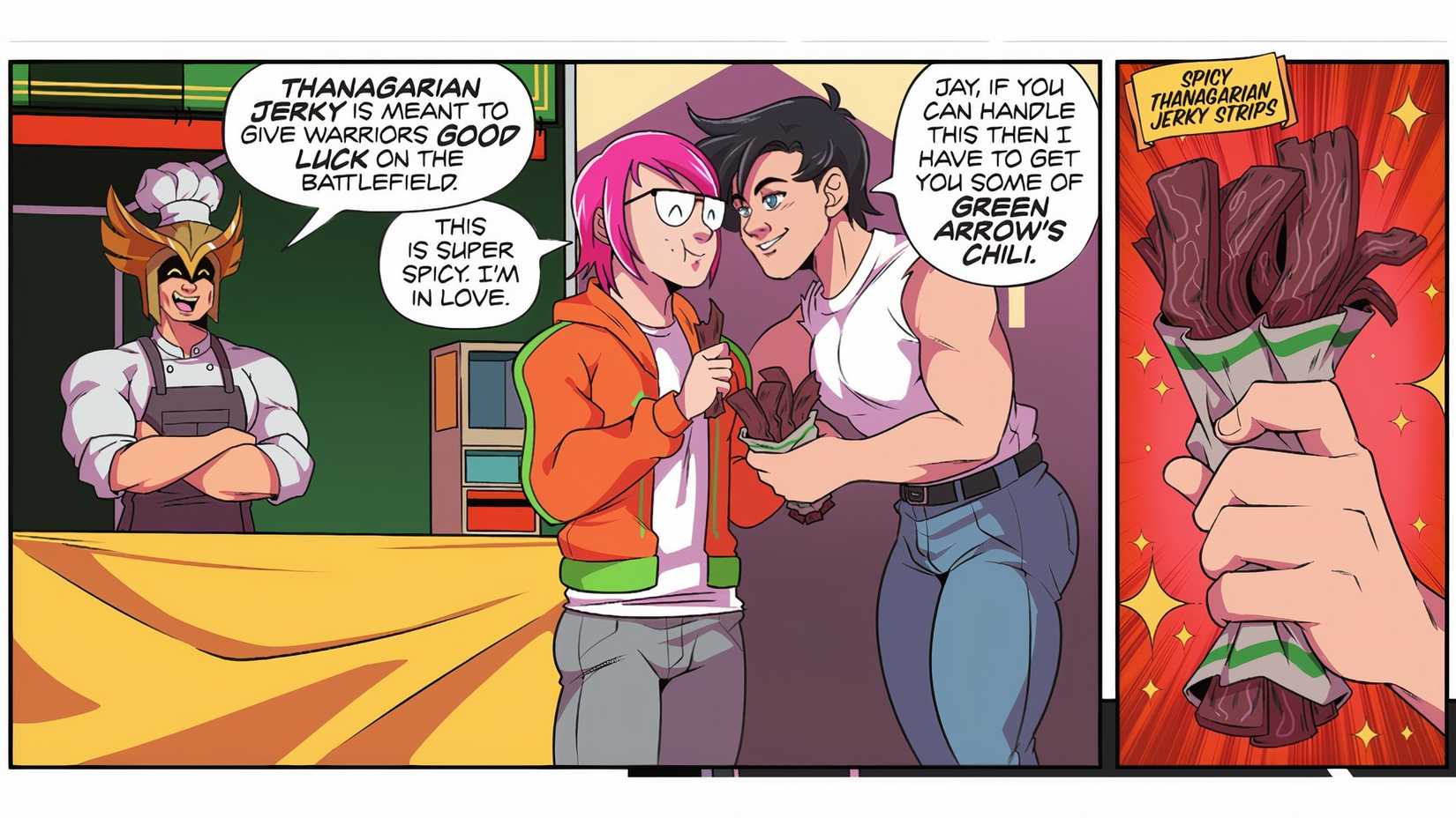 Cuando Superman Jon Kent visita el A-Town Food Festival con su novio Jay Nakamura en el Orgullo DC 2024 Historia número uno “Bros Down in A-Town” de Jarrett Williams, DJ Kirkland y Lucas Gattoni, la pareja prueba la auténtica cecina Thanagarian. El chef les informa que las auténticas tiras de cecina están destinadas a dar buena suerte a los guerreros en el campo de batalla. Jay es “enamorado” con el snack picante alienígena. En este dulce momento, Superman le dice a Jay que debería probar algo que muchos miembros de la Liga de la Justicia no pueden soportar: el chile de Green Arrow.