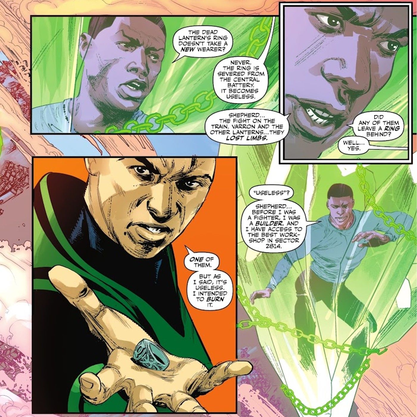 En su lucha contra la Reina Revenant y sus Radiant Dead, Linterna Verde John Stewart acaba de dar el salto de ser el Linterna Verde más poderoso del universo a ser el más peligroso del universo. Ahora equipados con un Lantern Ring impulsado por la energía Génesis y su propia voluntad, John Stewart y Steel muestran cuán potencialmente destructiva puede ser la ingeniería inversa de un Lantern Ring.