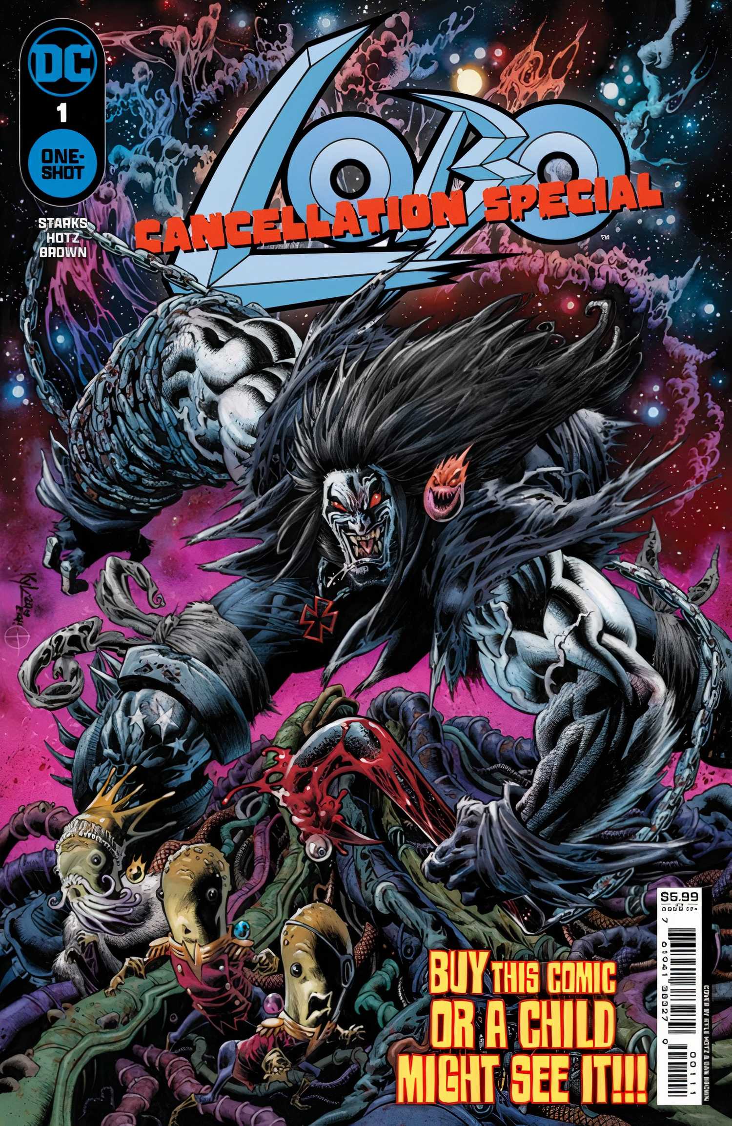 Kyle Starks y Kyle Hotz Especial Cancelación Lobo #1 ofrece un viaje salvaje de principio a fin, repleto de humor adulto y acción ultraviolenta. La aventura comienza con el Hombre Principal abandonado en un planeta primitivo durante seis largos años hasta que un grupo de extraterrestres lo rastrea, ansiosos por contratarlo para una misión: rescatar a la hija secuestrada de su rey del temible Murdercrotch Slaughterface (sí, leíste bien). ).