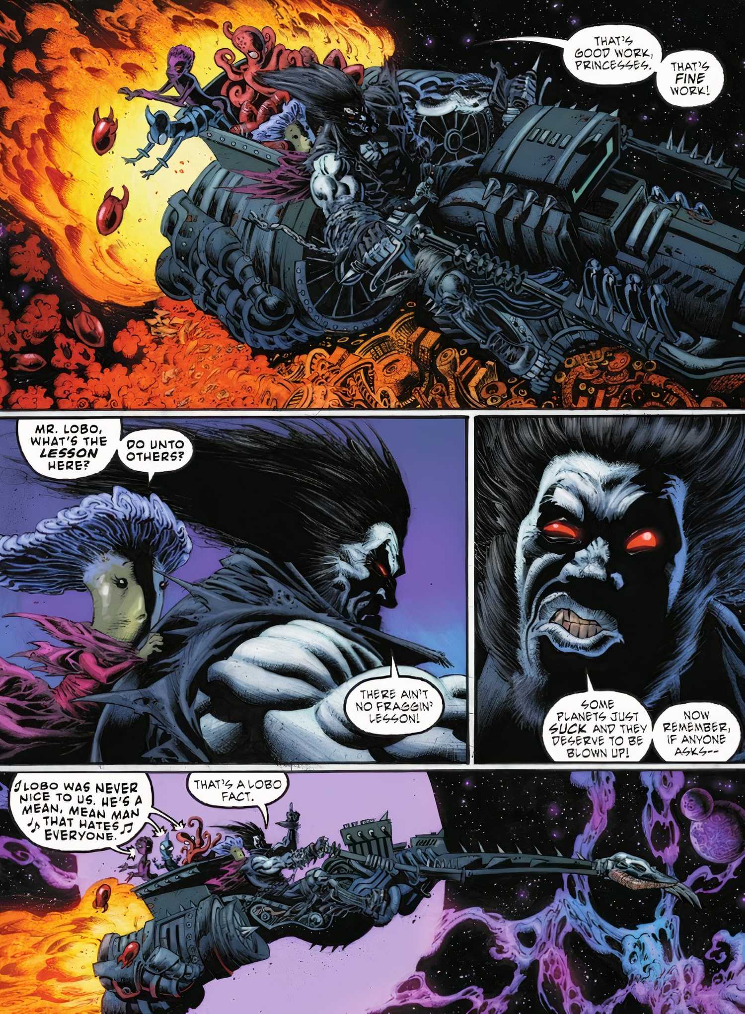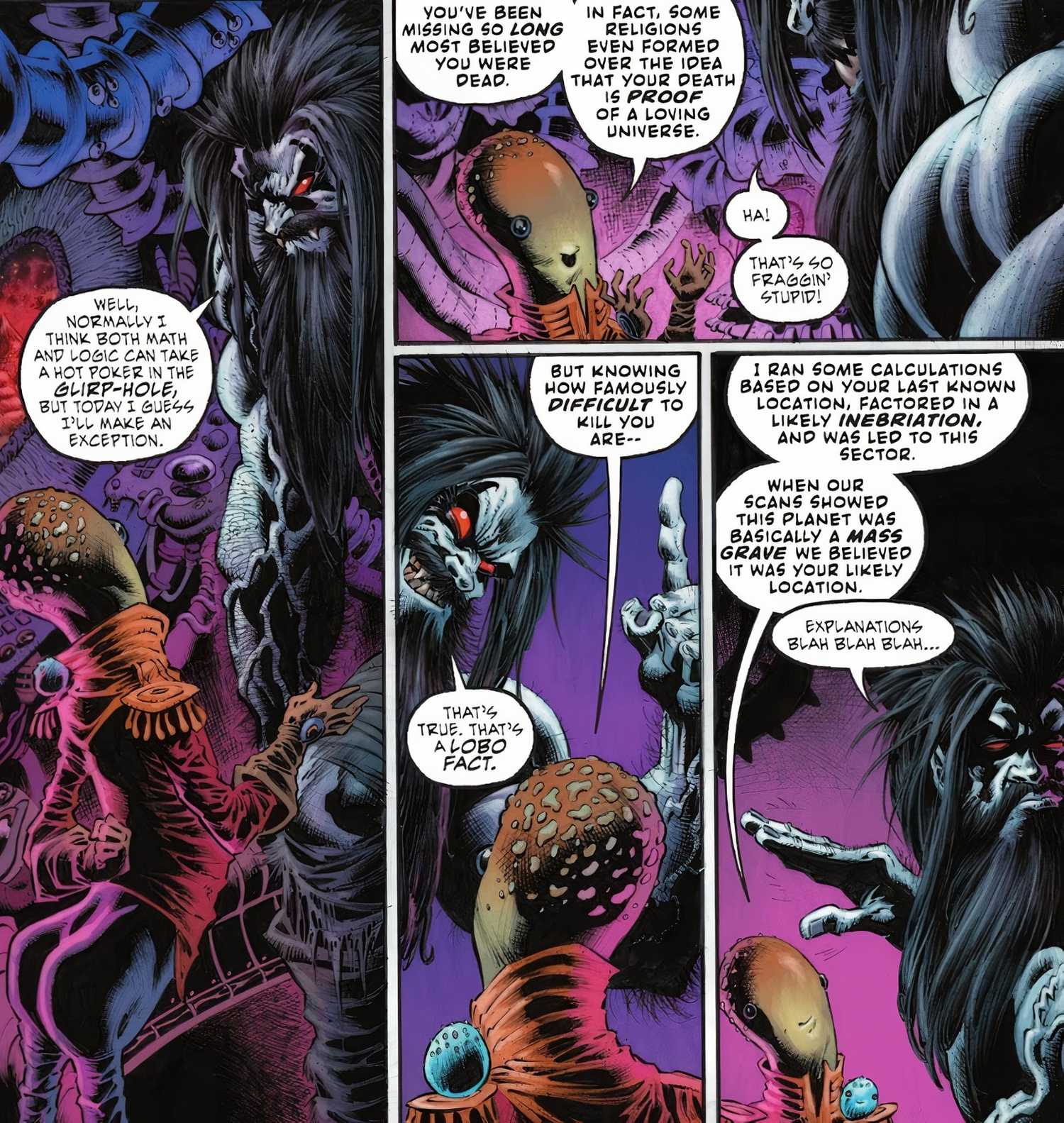 La influencia cósmica de Lobo en el Universo DC queda dramáticamente subrayada por la revelación de que Sin darse cuenta, ha engendrado múltiples religiones en todo el cosmos. Este descubrimiento se desarrolla a bordo de la nave espacial de los extraterrestres que han reclutado a Lobo para rescatar a la hija del rey. Mientras están en la nave, los extraterrestres expresan su consternación por la prolongada ausencia de Lobo, lamentando que muchos hayan llegado a creer que estaba verdadera y completamente muerto. En respuesta a su supuesta muerte, surgieron varias religiones, interpretándola como una señal de que el universo es, de hecho, un lugar amoroso y misericordioso. Esta revelación no sólo es innegablemente hilarante sino que también sirve para resaltar la asombrosa influencia de Lobo en todo el DCU.
