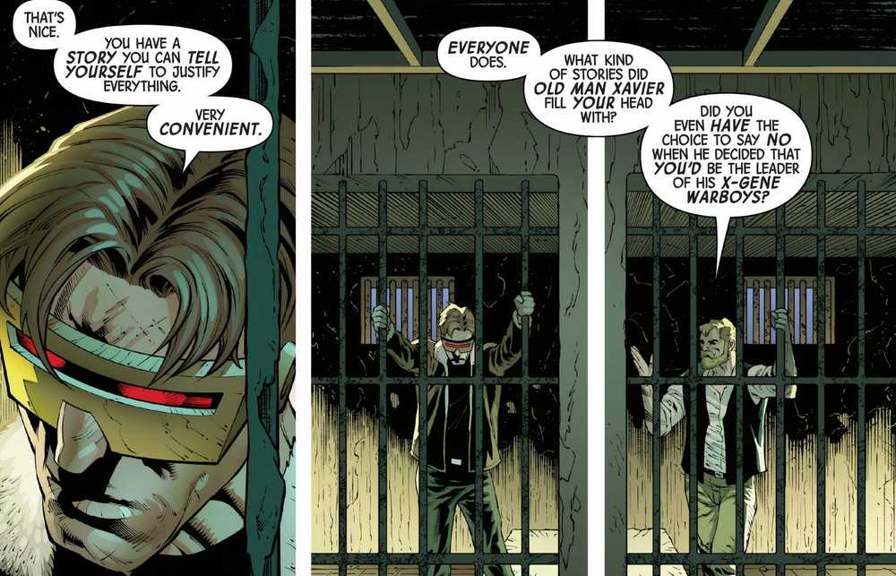 Su pelea aterrizó a Lundqvist y Cyclops en la cárcel, donde lo “dormían” en células adyacentes. Los dos tienen la oportunidad de discutir sus diferencias, que es cuando Lundqvist menciona a Charles Xavier y le pregunta a Cyclops qué tipo de historias se alimentó al profesor X a los X-Men cuando eran niños para convertirlos en sus soldados. O como Lundqvist los llama “,Warboys X-Gene.