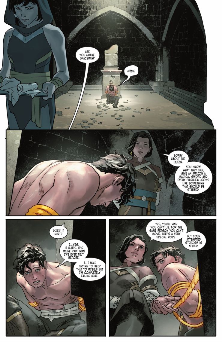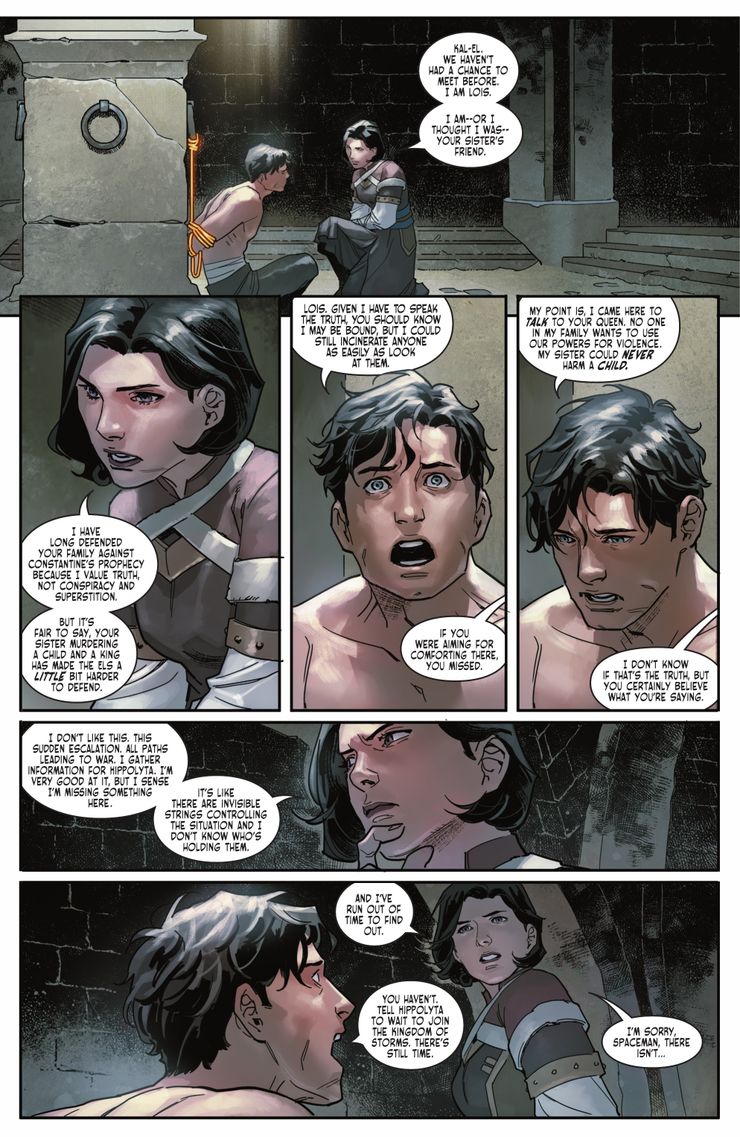 los Caballeros oscuros de acero La serie de Tom Taylor y Yasmine Putri imagina un mundo en el que la familia El aterriza junta en la Tierra en la época medieval, en lugar de un niño Kal-El que llega solo a la Tierra en el siglo XX. La serie es un Game of ThronesUna historia al estilo de reinos en guerra e intrigas palaciegas, entrelazada con algunos de los héroes más grandes de DC, incluidos Black Lightning, Wonder Woman, Batman y, por supuesto, Superman. Lois, que es asesora de la princesa Diana, se encuentra por primera vez con Kal-El en el número 6, usando el Lazo de la verdad para descubrir por qué aparentemente invadió la Amazonía. Su química natural brilla de inmediato, y ella lo llama “Spaceman” sin pensarlo dos veces.