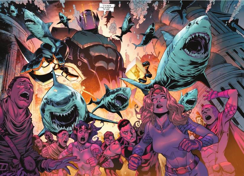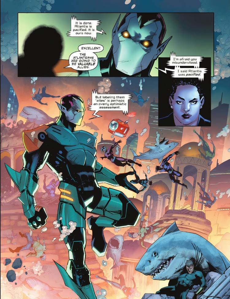 - Aquaman apenas escapa cuando Depth Charge toma el control de Atlantis con un ejército de tiburones.