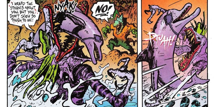 La reacción de Aquanyx al ataque del delfín es tan dramática que solo podría percibirse como cómico o que algo más está sucediendo debajo de la superficie (sin juego de palabras). Antes de que ocurra el ataque al delfín, Aquanyx menciona cómo salvó a Matilda de Blackmantasaurus solo unos momentos antes, lo que significa que el delfín es más que una marsopa al azar que salvó. Definitivamente trae a la mente Los chicos’ obviamente, la parodia de Aquaman The Deep, que fue igualmente protectora y sensible sobre un delfín que fue abusado en un parque de diversiones.