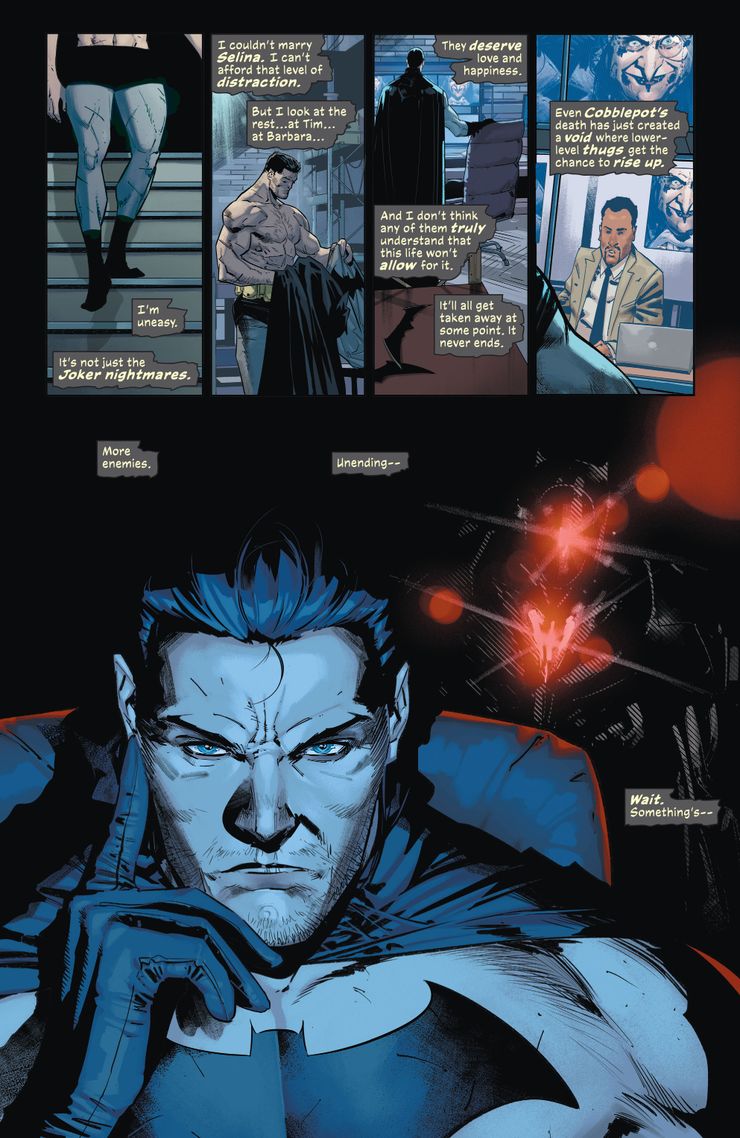Para cualquier fanático de Batman, esta vista previa es extremadamente desalentadora. Sufrir pesadillas sobre Joker, sentir que no puede casarse con Catwoman, desear la felicidad de su familia de aliados pero sentir que les ha robado la oportunidad, todo es extremadamente deprimente. Batman ni siquiera puede encontrar el lado positivo de la muerte de Penguin dada su renuncia a que alguien más simplemente intervenga para llenar el vacío. Creyendo que todo es inútil e interminable, está claro que alguien necesita sacar a Bruce de este gran pozo de oscuridad en el que ha caído. Si bien la Bat-Familia, naturalmente, ha estado preocupada por Bruce, que ha pasado todo su tiempo como Batman, tal vez sea hora de una intervención más intencional.