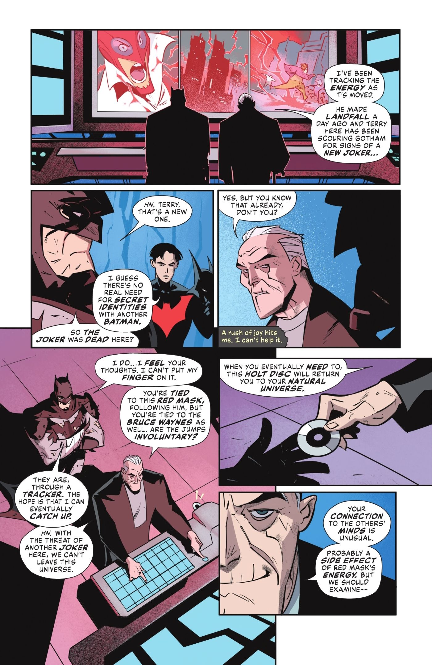 La aventura del multiverso de Batman llega a su fin en hombre murciélago #135 por Chip Zdarsky, Mike Hawthorne, Jorge Jimenez, Mikel Janin, Adriano Di Benedetto, Tomeu Morey y Romulo Fajardo. En este número, mientras persigue al villano Darwin Halliday, Batman es transportado a través de varias Tierras diferentes, cada una con su propio Batman. Cada uno de estos Batmen está lidiando con su propia versión de Joker, que se ha vuelto loco debido a la influencia de Halliday. Y dado que Bruce está siendo arrastrado por el multiverso en respuesta a que Halliday se mueve entre universos, no puede quedarse y ayudar a ninguno de los Batmen a lidiar con sus Jokers. Pero sabiendo a lo que se enfrenta Bruce, cada Batman se las arregla para ahorrar una pieza de equipo para ayudar a Bruce en su viaje.