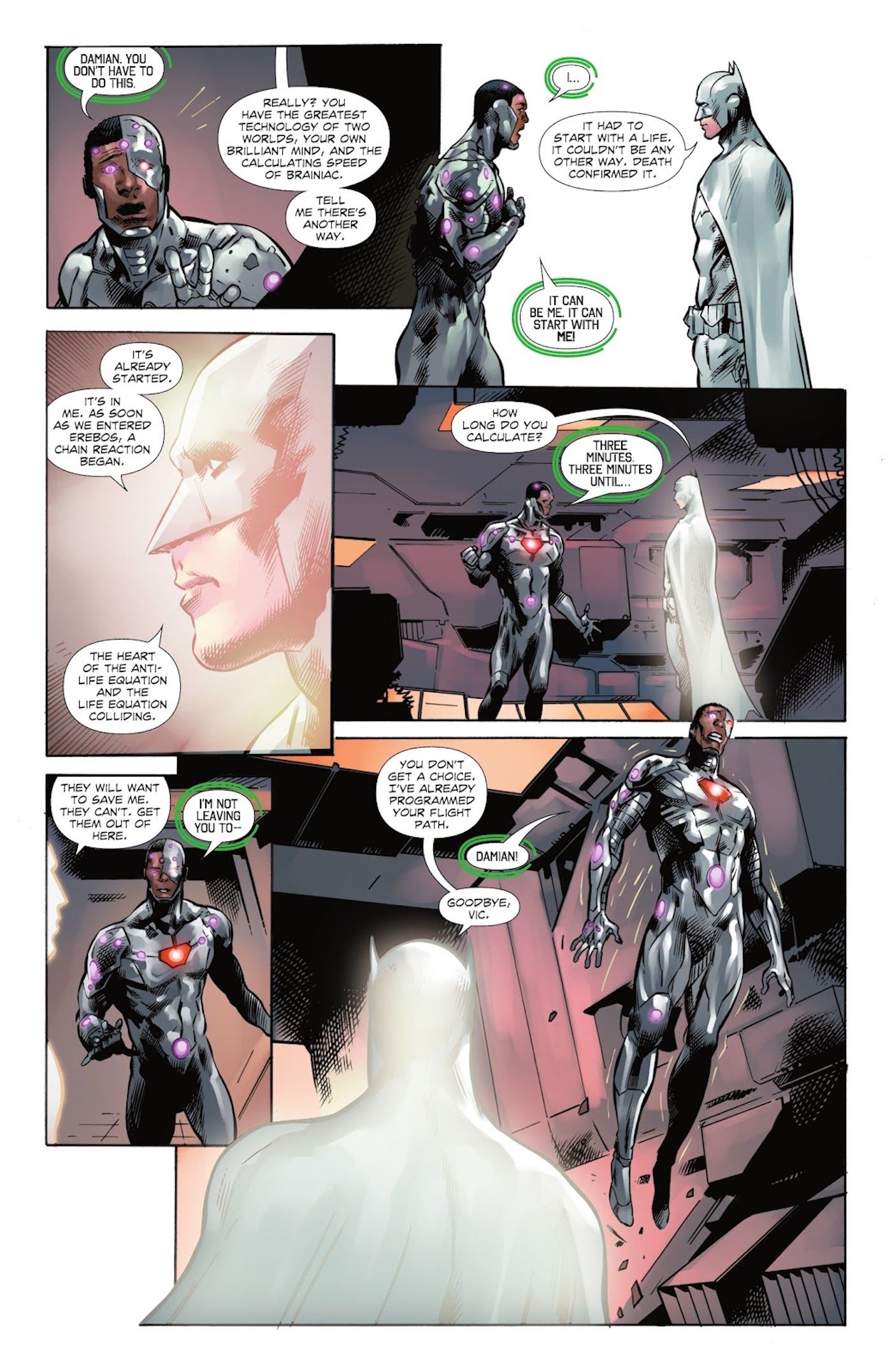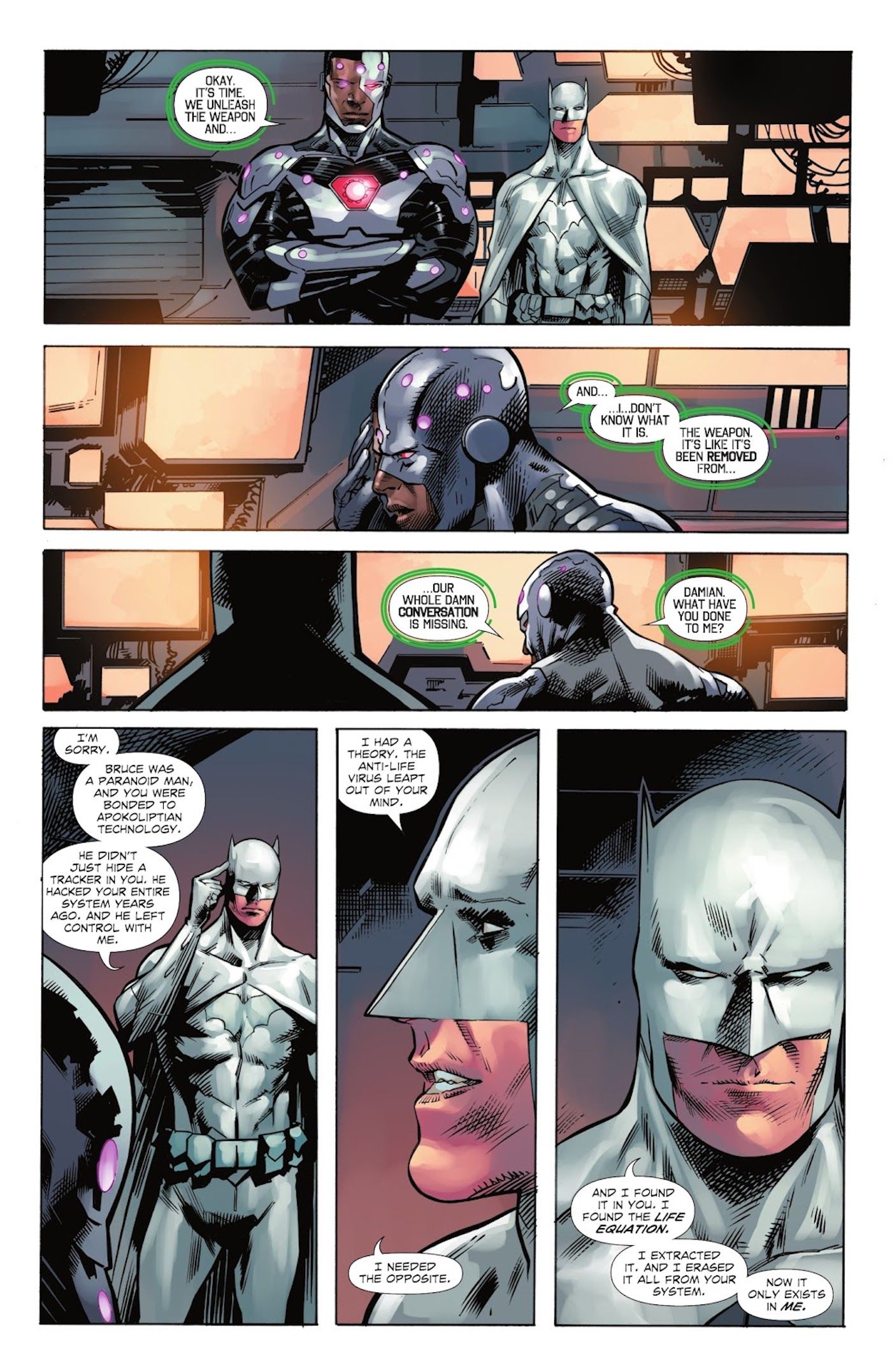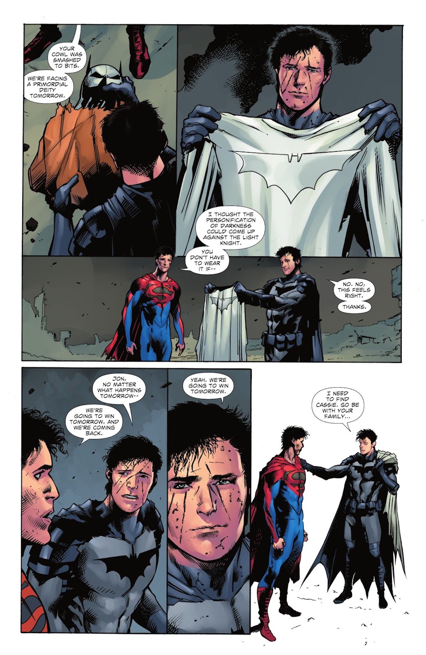 DCeased: Guerra de los Dioses No Muertos #8 por Tom Taylor, Trevor Hairsine, Lucas Meyer, Andy Lanning, Rain Berebo y Saida Temofonte ve a los restos de la humanidad unirse con Darkseid y los Nuevos Dioses recientemente liberados para acabar con la amenaza del Virus Anti-Vida de una vez por todas. Antes de que los héroes y antiguos villanos puedan partir para llevar a cabo su plan final, Damian Wayne, ahora Batman tras la muerte de su padre, es detenido por su amigo y compañero Super Son Jonathan Kent. Luego, el nuevo Superman le recuerda a Damian su cumpleaños número 18 y le regala a su amigo un traje de Batman completamente blanco: “Pensé que la personificación de la oscuridad podría enfrentarse al Caballero de la Luz.“