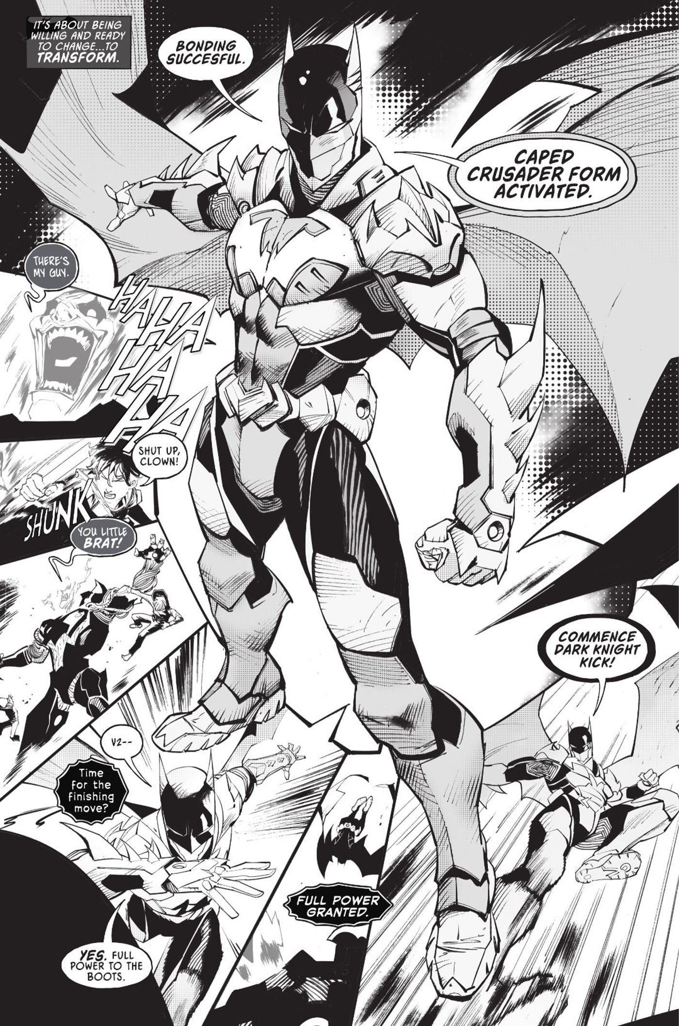 Batman despacha fácilmente a la pandilla, pero una de las amenazas cibernéticas vuelve a ponerse de pie, ahora piloteada por el Guasón. El control del villano sobre el secuaz de la Escalera Real resulta demasiado para que Batman lo maneje solo. Activa la secuencia de unión de V2, lo que hace que el murciélago robótico se fusione con la armadura de Batman. Con su ‘Forma de cruzado con capa’ ahora activada, Batman le da la vuelta al avatar del Guasón. Batman dirige todo el poder de su armadura a sus pies y destruye al villano con una poderosa patada.