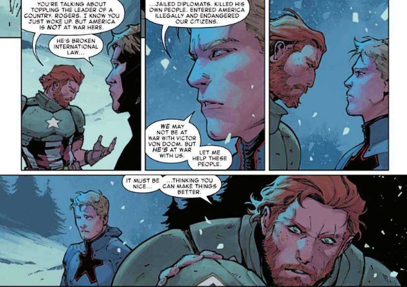 Es decir, en la vista en blanco y negro de Rogers, el doctor Doom es un tirano y, por lo tanto, debe ser derrocado. La perspectiva de Colton está coloreada en Shades of Grey, ya que le recuerda severamente al OG Capitán América que su misión no es un cambio de régimen, sino más bien la extracción de rehenes, a la que Rogers admite a regañadientes que necesita aprender cómo existir en esta nueva era.