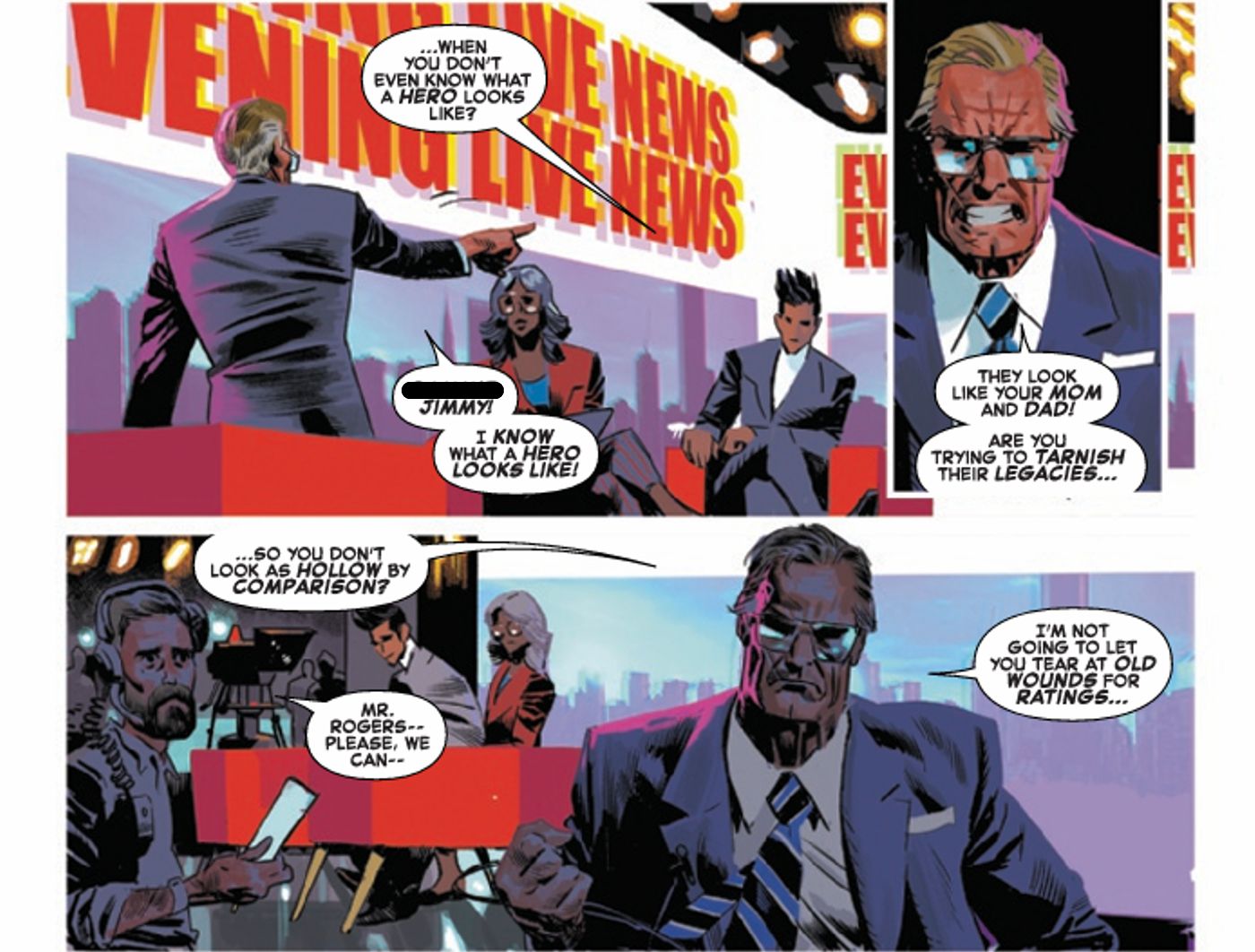 Vengadores: Crepúsculo #1 de Chip Zdarsky, Daniel Acuña y Alex Ross tiene lugar en un futuro oscuro donde Steve Rogers es un anciano testarudo, retirado de sus días de lucha contra el crimen. Vive en una ciudad de Nueva York que tiene protectores nuevos y corruptos en lugar de los Vengadores. Los Vengadores han sido rebautizados como “The Avenger Patrol”, un equipo más joven y comercializado dirigido por James Stark de Stark Technology, el hijo de Iron Man y Wasp.