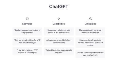 La página de destino de ChatGPT les dice a los usuarios qué esperar del agente de conversación, señalando que tiene sus limitaciones y que no elaborará una respuesta sobre “solicitudes inapropiadas. ” También proporciona algunos ejemplos de lo que se puede pedir, como “¿Tienes alguna idea creativa para el cumpleaños de un niño de 10 años?” y “Explicar la computación cuántica en términos simples. ” Ingrese un mensaje en el cuadro de diálogo en la parte inferior de la pantalla, y el chatbot podrá escribir su respuesta.