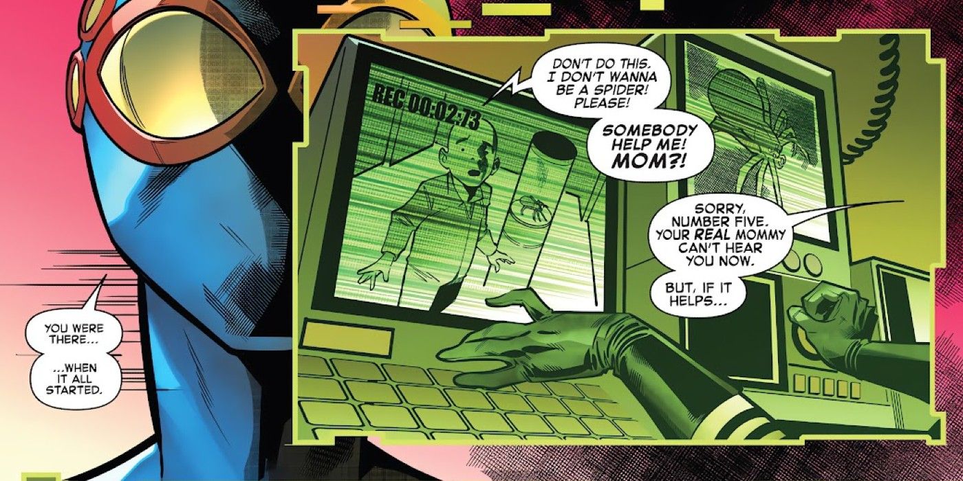 “/> Este número ofrece a los lectores una primera muestra de la historia del origen de Spider-Boy. Antes de que los recuerdos del Universo Marvel fueran borrados de su existencia, Bailey Briggs era un experimento bajo la dirección de Madam Monstrosity, quien lo mezcló genéticamente con el ADN de una araña. Si eso le suena familiar, entonces debería serlo porque es extremadamente similar a los orígenes de Jessica Drew. Mientras Jessica yace en una cama de hospital debido a una intensa exposición al uranio, su padre intenta salvarle la vida inyectándole sangre de araña. A partir de ese momento, la vida de Jessica nunca volvió a ser la misma, convirtiéndola para siempre en la Mujer Araña.