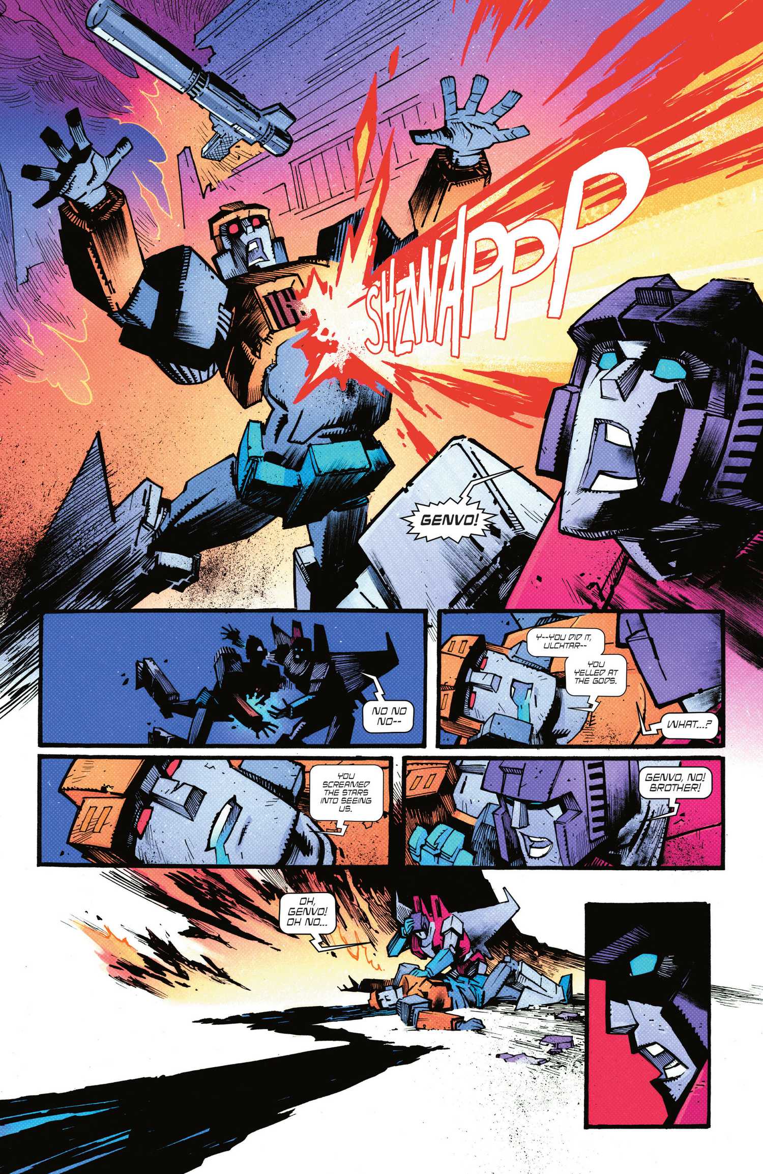transformadores El número 13 de Daniel Warren Johnson, Jason Howard, Mike Spicer y Rus Wooton recuerda los primeros días de Starscream en Cybertron. Los lectores aprenden que una vez fue un Un científico pacífico llamado Ulchtar, que se une a sus amigos Jetfire y al nuevo robot Genvo para presenciar el sobrevuelo de Omega Supreme..